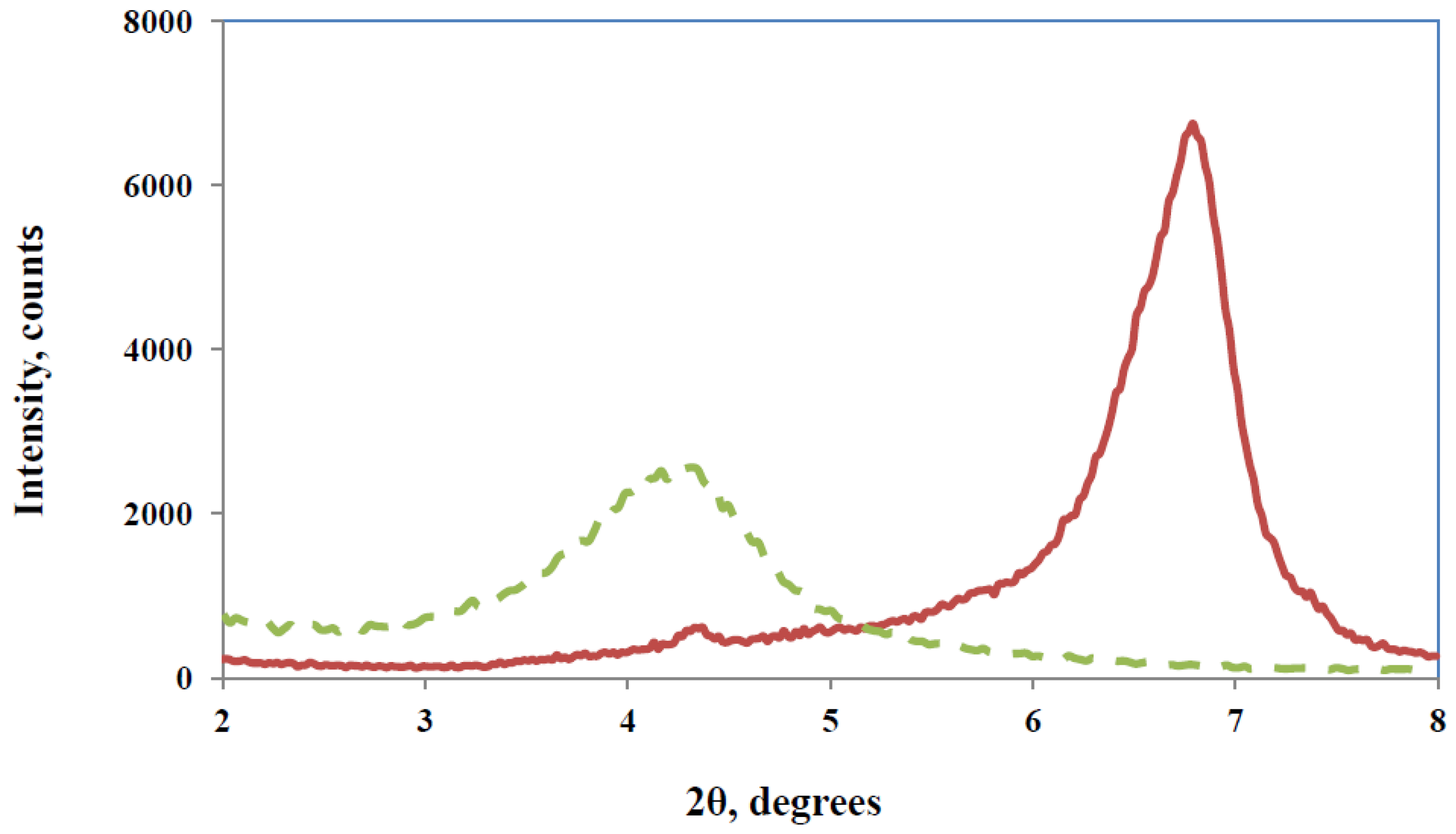 As an alternative to the somewhat impractical pre-conditioning procedure, we proposed earlier that the intra-gallery reaction could be promoted instead by incorporating an initiator of cationic homopolymerisation within the clay galleries before mixing the resin with the clay and adding the curing agent [21]. The preparation procedure described further above did indeed incorporate the initiator, BF3·MEA, into the clay galleries, as was demonstrated by SAXS, resulting in fact in a decrease in the layer d-spacing, from 2.1 nm for the organically modified MMT to 1.3 nm, as shown in Figure 4. This can probably be attributed to the interchange of the monoethylamine of the BF3 complex with the octadecyl ammonium salt of the organically modified MMT, and is therefore indicative of the presence of BF3·MEA within the clay galleries. Despite this reduction in the d-spacing, when the TGAP epoxy was mixed with this “initiated” clay, the resin intercalated into the clay galleries and caused the d-spacing to increase to 4.4 nm, a larger separation than the d-spacing of 3.5 nm found for the TGAP intercalated directly into the organically modified MMT [21].