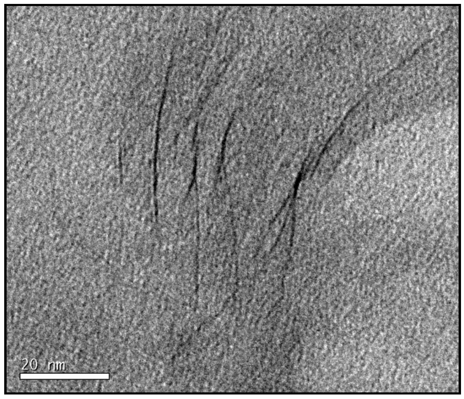 The unmodified nanoclay, such as montmorillonite (MMT), consists of stacks of silicate layers, each of the order of 1 nm thick, and is naturally hydrophilic and hence unsuitable for use as a filler in most of the commonly used epoxy resins, which are hydrophobic. Consequently, the montmorillonite clay is commonly modified organically by an ion exchange process in which the cations are replaced by, for example, quaternary ammonium ions with long alkyl chains. This not only makes the clay organophilic but also increases the spacing between the clay layers, which facilitates the intercalation of the epoxy resin in the preparation of the epoxy-clay nanocomposites. In order to accomplish the desired improvement in mechanical properties of these nanocomposites, it is necessary for the clay layers to be further separated and dispersed homogeneously throughout the polymer matrix, in a process referred to as exfoliation [4,5], when the epoxy-clay mixture is cured. However, achieving a highly exfoliated nanostructure in these epoxy layered silicate nanocomposites has proven difficult, and it is common to refer to “partial” exfoliation or to consider the nanostructure to be exfoliated when the d-spacing of the clay layers cannot be detected by Small Angle X-ray Scattering (SAXS), which normally implies layer separations greater than about 8 nm [6,7,8,9,10]. Very large layer separations is not the only reason for the absence of diffraction peaks, however, as has been noted by several authors [11,12,13], and consequently it is important that nanostructural characterisation by Transmission Electron Microscopy (TEM) should also be made.