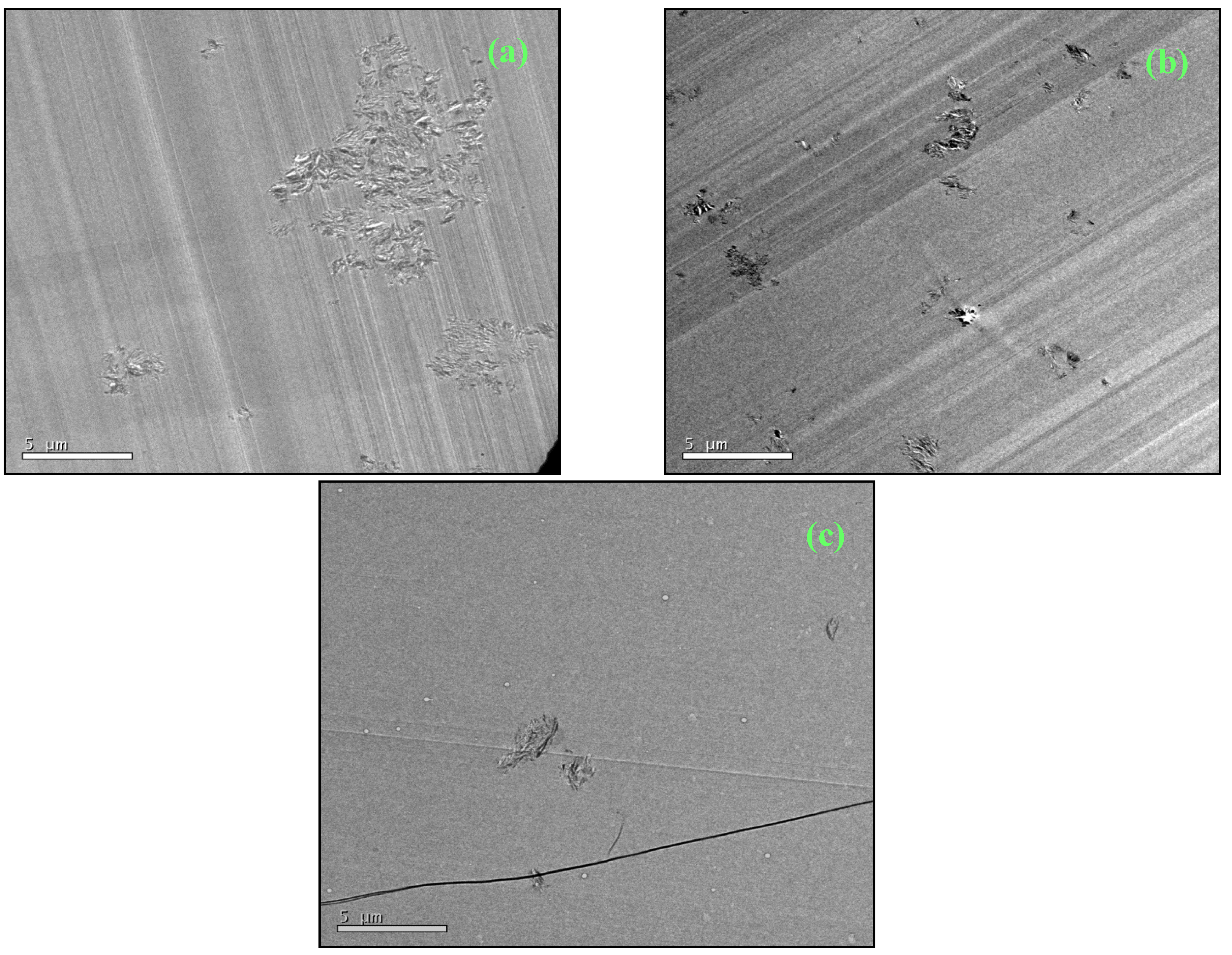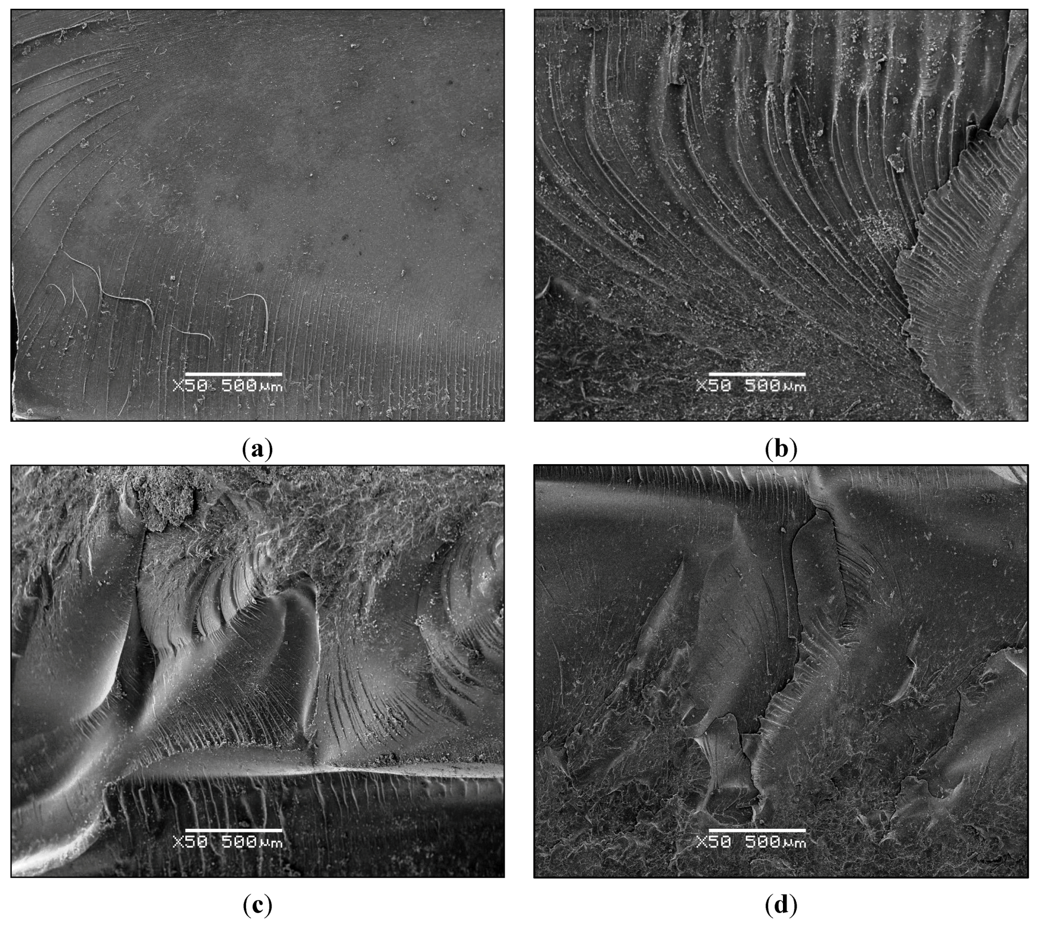 The reference sample TGAP/DDS without any clay (Figure 16a) shows the typical rather brittle fracture surface, with only a few striations where the crack velocity has increased. The amount of striations in Figure 16b, for the TGAP/MMT/DDS sample cured isothermally at 150 °C, is significantly greater, and the characteristic parabolic shape associated with the divergence of the crack from one plane to another can be seen. The overall appearance, though, is of an essentially planar fracture in both Figure 16a,b, and furthermore with little evidence of plastic deformation. On the other hand, the fracture surfaces seen in Figure 16c,d, for the pre-conditioned sample and the sample in which the BF3·MEA initiator was used, respectively, both show a generally much rougher surface. This is consistent with the significantly higher values of impact energy listed in Table 2 for these samples, and can be interpreted in terms of an increase in the fracture surface area as the mechanism responsible. In this respect, we adhere to the interpretation proposed by Wang et al. [33] for the toughening of “highly exfoliated” nanocomposites. These authors suggest that microcracks are formed in these nanocomposite systems in the regions close to the clay layers, and that these microcracks then propagate. So that they do not coalesce easily, they should not be coplanar, and so that many are initiated it is necessary for the clay layers to be separated, and not exist in large agglomerations. This scenario points to the need for an exfoliated nanostructure, and the increase in the impact energy comes from the increase in the fracture surface area due to a large number of microcracks as well as their deflection when the propagating crack meets a clay layer.