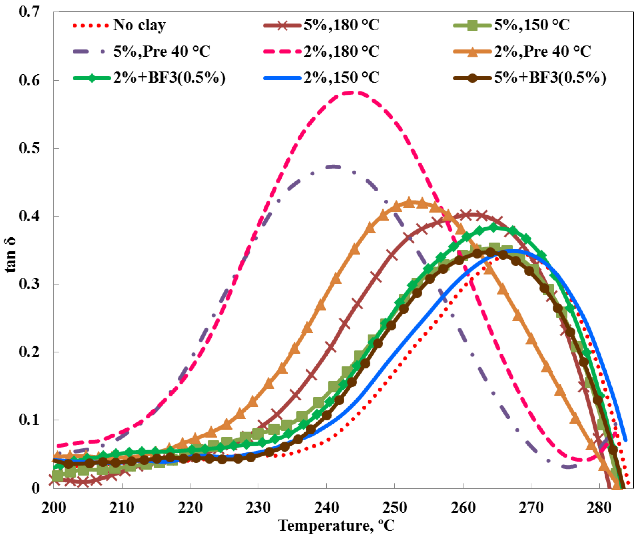 Very little systematic correlation could be found between the storage modulus, evaluated in the glassy region at 50 °C, and the preparation procedure. The sample 2%, 180 °C prepared by the standard procedure again presents a somewhat anomalous behaviour, with a modulus more than 30% higher than the reference. In contrast, the nanocomposites prepared by the pre-conditioning procedure displayed lower values of storage modulus than the reference, particularly sample 2%, pre 40 °C, for which the storage modulus was reduced by almost 50%. This is presumably related to the greater extent of homopolymerisation in these nanocomposites, noted above also in respect of their Tα values, which results in a less cross-linked network structure. In the other nanocomposites, which all have the same modulus as the reference, within experimental error, it is likely that there is a competition between the effect of the clay, which is to increase the modulus, and the effect of homopolymerisation, occurring in all these systems to a greater or lesser extent, which is to reduce the modulus. As a consequence, no significant or systematic variations are observed.