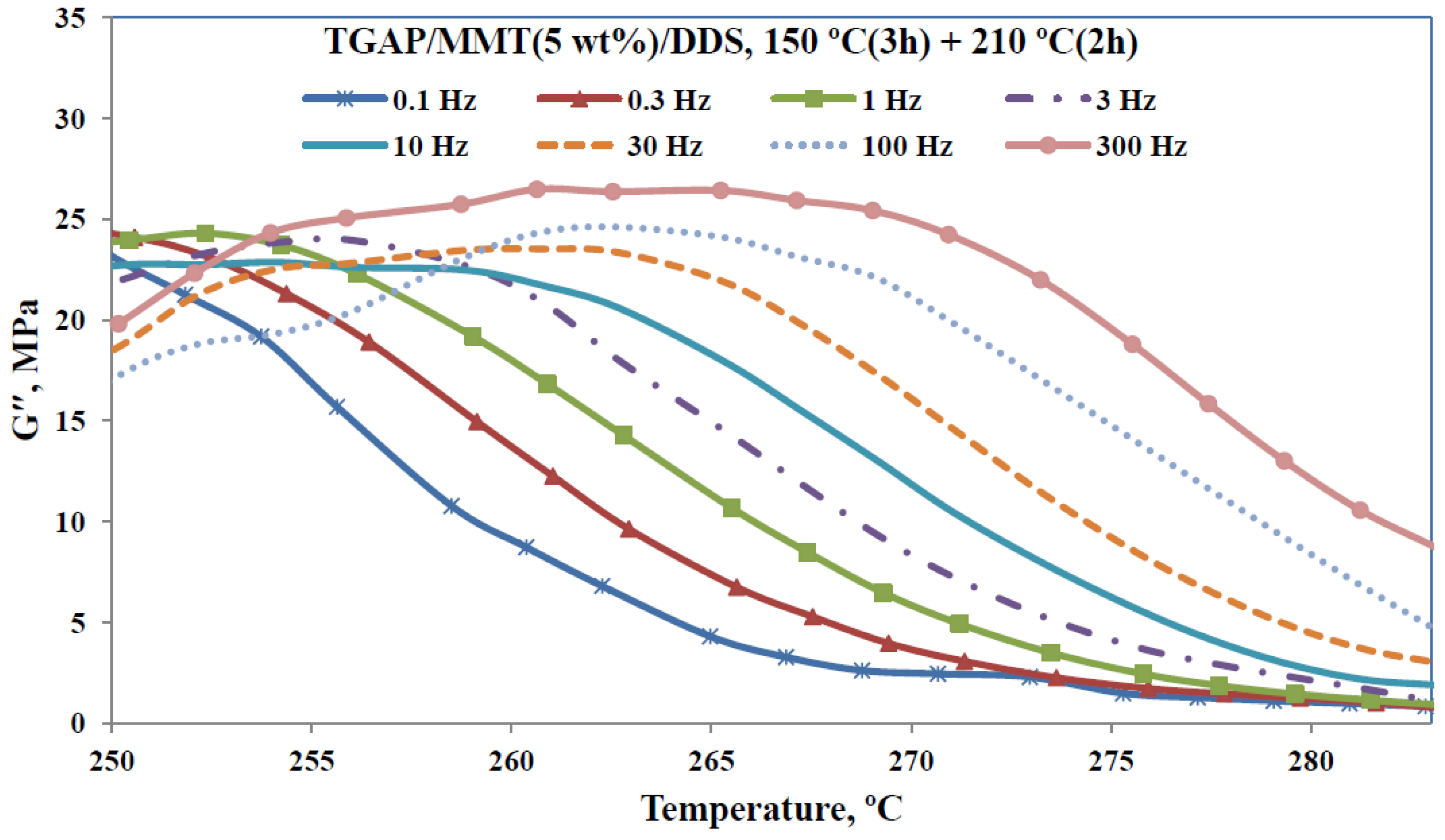 On the other hand, for filled systems such as the present PLS nanocomposites, the effect of the clay reinforcement will be more effective in the rubbery region than in the glassy region, and as a consequence there will be a corresponding effect on the location of the tan δ peak. It would therefore be interesting to examine also how the loss modulus depends on frequency and nanocomposite preparation method. Figure 12 shows the loss modulus curves for the nanocomposite sample TGAP/MMT(5)/DDS(52), for which the clay content is 5 wt%, the sample having been cured isothermally at 150 °C and then post-cured at 210 °C.