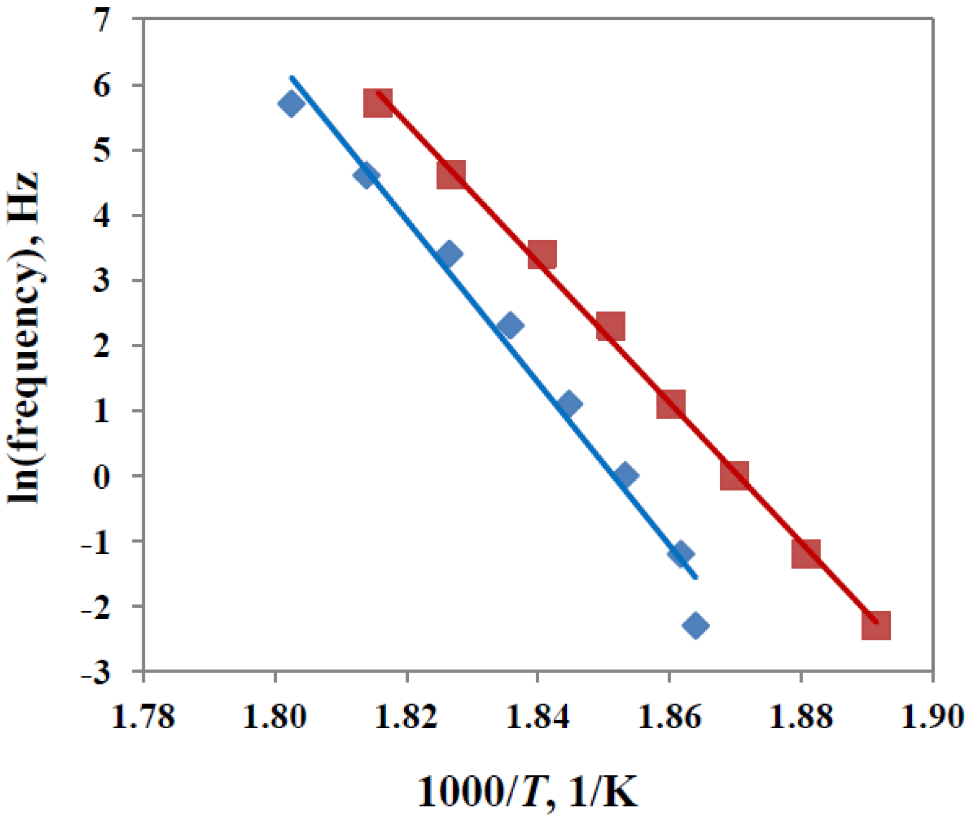 Figure 13. Plot of ln(frequency) versus inverse temperature for the frequency shift of the loss modulus curves, for two TGAP/MMT/DDS nanocomposite systems: red squares, 5 wt% clay content; blue rhombus, 2 wt% clay content.