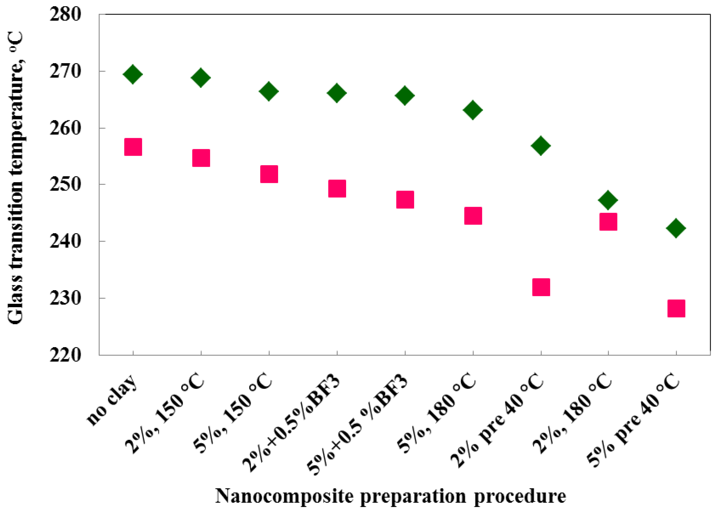 It can be seen from Figure 14 that the DMA values for Tα are systematically greater than the TOPEM values, except for the result for sample 2%, 180 °C which again appears “anomalous”, as it did in Figure 11. The systematic difference between the mechanical and calorimetric α-relaxation temperatures is a consequence of the different frequencies at which Tα is determined. Over the whole range of nanocomposites in Figure 14, the average difference is about 16 °C, which corresponds to the same activation energy of 800 kJ/mol that was found earlier from the frequency dependence of the tan δ peaks. The slight decrease in Tα with the addition of clay is evident from this figure, as also is the more significant decrease for the preparation procedure involving pre-conditioning, which can be explained on the basis of the significant amounts of homopolymerisation which occur during pre-conditioning, resulting in a reduced cross-link density in the epoxy network.