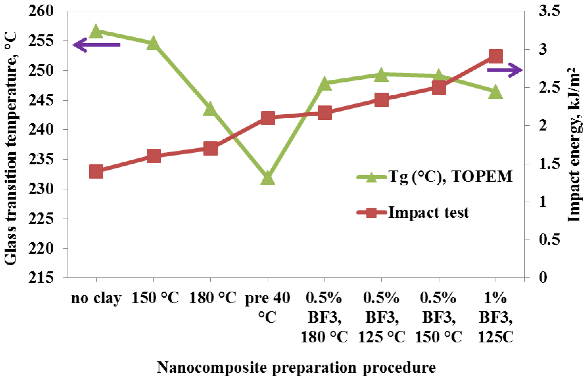 Table 2. Values of the impact strength for different TGAP/clay nanocomposites with 2 wt% and 5 wt% MMT. Reference: 1.40 ± 0.18 kJ/m2 (No clay).