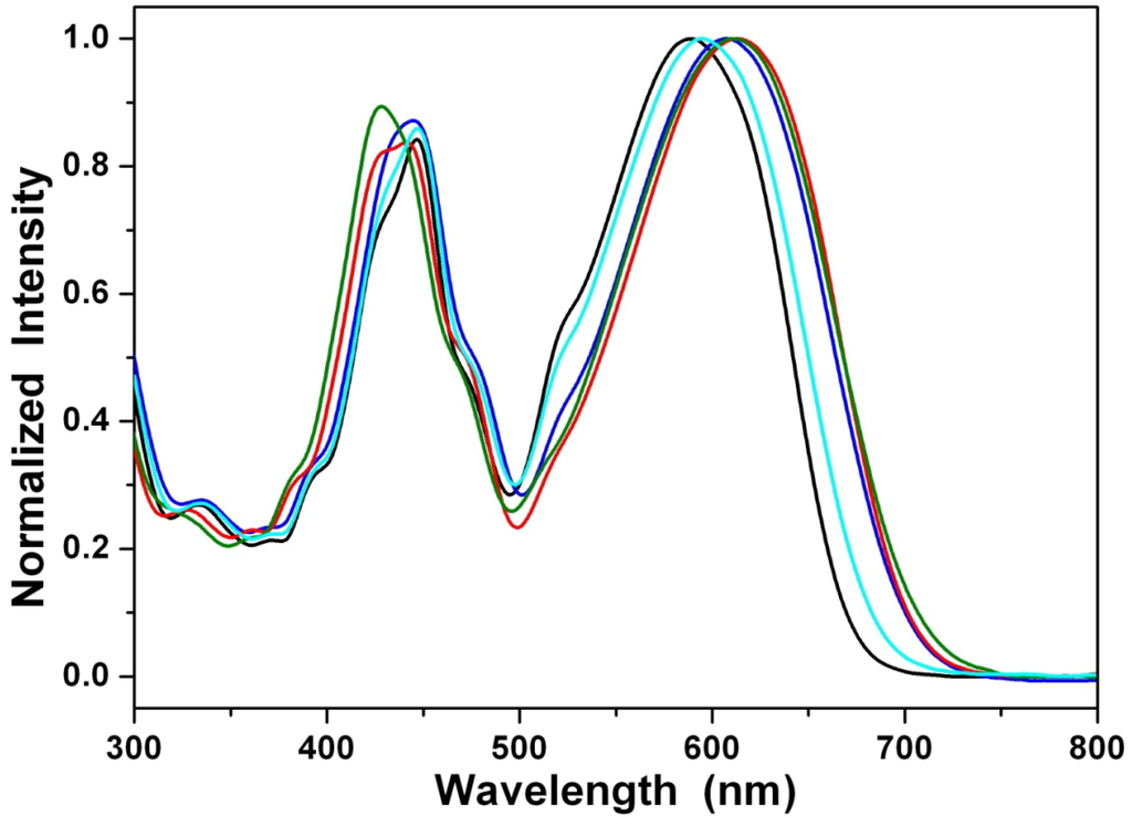 Normalized absorption spectra of 1a in cyclohexane (black line), diethyl ether (cyan line), ethyl acetate (blue line), dichloromethane (green line) and acetonitrile (red line).