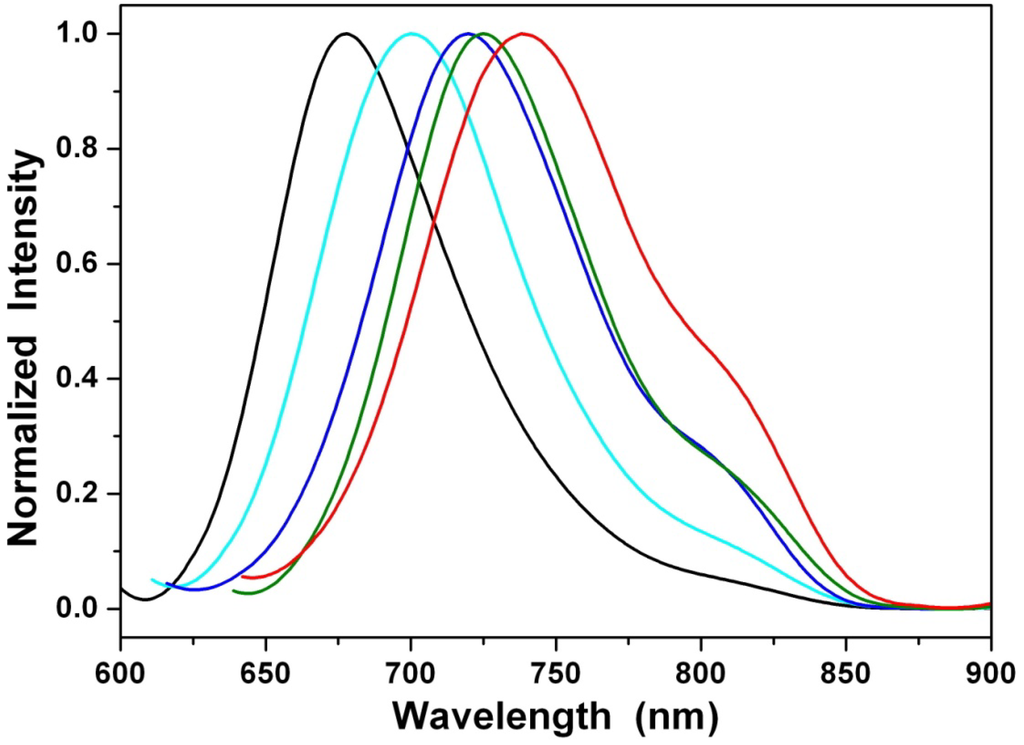 Normalized emission spectra of 1a in cyclohexane (black line), diethyl ether (cyan line), ethyl acetate (blue line), dichloromethane (green line) and acetonitrile (red line).