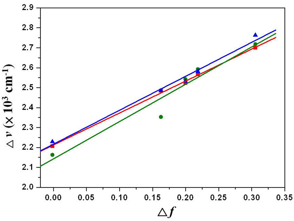 The plot of the Stokes shift υa − υf as a function of Δf is sufficiently linear for 1a–1c (Figure 5). Accordingly,