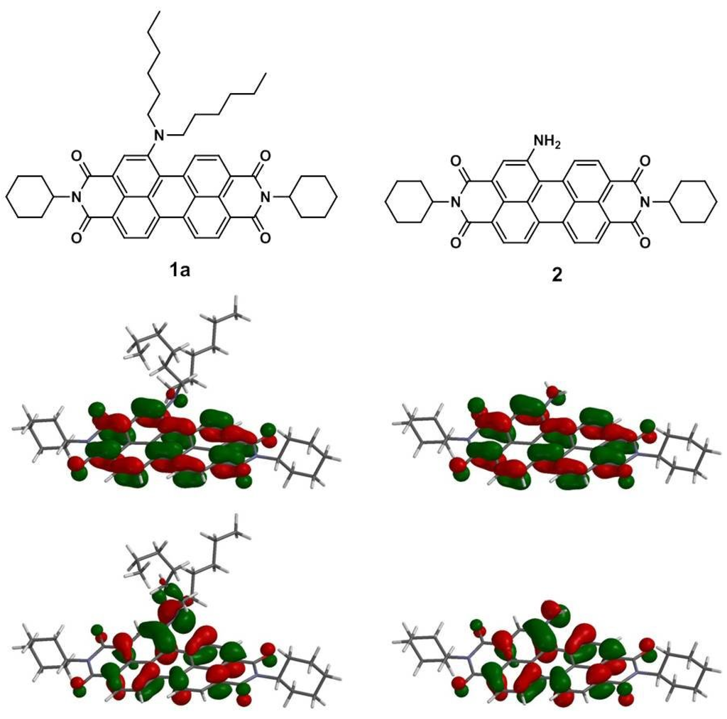 To gain more insight into the molecular structures and electronic properties of 1–4, quantum chemical calculations were performed using density functional theory (DFT) at the B3LYP/6-31G** level [88,89]. The highest occupied molecular orbitals (HOMOs) and the lowest unoccupied molecular orbitals (LUMOs) of 1a and 2 are shown in Figure 6. The HOMO of all amino-substituted PBIs (1a–1c and 2) is delocalized mainly on the amino group and the perylene core, while the LUMO is extended from the central perylene core to the bisimide groups. The calculated and experimental parameters for perylene bisimide derivatives 1–4 are summarized in Table 2. It is apparent that the HOMO/LUMO energy levels of 1a–1c and 2 are higher than those of 3 and 4; this can be explained by the fact that the amino (nitro) substituent is a strong electron-donating (electron-withdrawing) group and hence increases (decreases) both the HOMO and LUMO energy levels. Additionally, the relative band gap energies estimated from the longest absorption maxima of 1–4 are in good agreement with the theoretical calculations (Table 2).