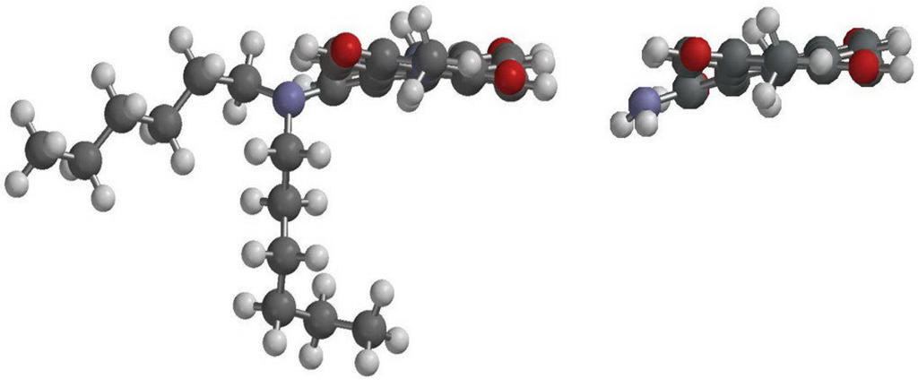 DFT calculations also show that the ground-state geometries of the perylene core have different core twist angles (Figure 7), i.e., approximate dihedral angles between the two naphthalene subunits attached to the central benzene ring; these are ~9.40° and ~13.43° for 1a, ~9.42° and ~13.45° for 1b, ~9.45° and ~13.49° for 1c, ~9.23° and ~17.49° for 2 and ~7.89° and ~15.87° for 3 (Table 2); and all are larger than those of 4 (~0.00°). As a whole, the core twist angles of the mono-substituted PBIs (1–3) are larger than that of the non-substituted compound (4).