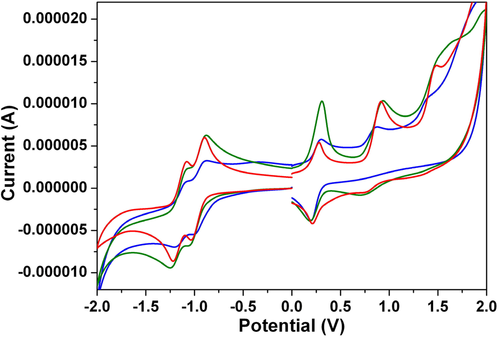 The cyclic voltammograms of 1a (blue line), 1b (green line) and 1c (red line) measured in dichloromethane solution with ferrocenium/ferrocene as an internal standard, at 200 mV·s−1.