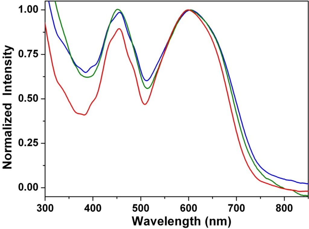 Normalized absorption spectra of 1a (blue line), 1b (green line) and 1c (red line) in neat film.