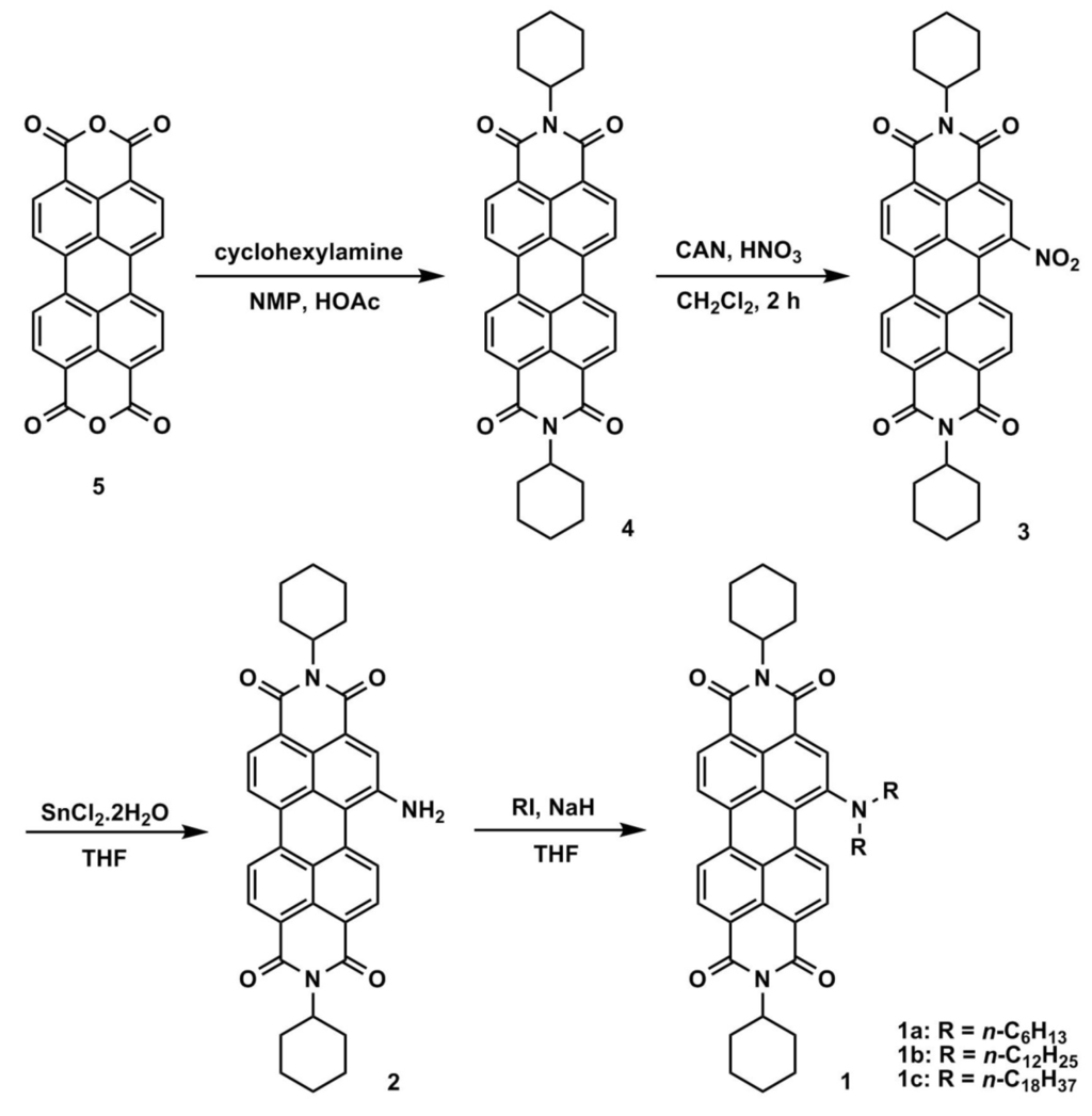 To date, a useful strategy for introducing substituents onto the PBIs core is bromination of perylene dianhydride. Subsequently, nucleophilic substitutions and metal-catalyzed cross-coupling reactions can then be executed. However, these reactions are usually accompanied by extensive debromination [78] and stringent reaction conditions, such as high temperatures and absence of water and oxygen. In an effort to expand the scope of PBI-based chromophores available for designing systems for colorful dyes and charge transport, we synthesized a series of purple dyes based on 1-aminoperylene bisimides [76]. We now report on the introduction of different long alkyl chains of 1-aminoperylene bisimide (2) affording chromophores (1a–1c) that are intense green in color and that readily undergo two quasi-reversible one-electron oxidations and two quasi-reversible one-electron reductions.