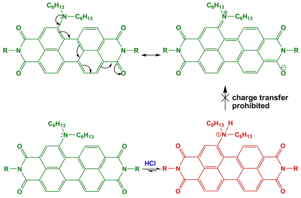 The effects of strongly acidic conditions on the absorption and emission spectra of 1a were also examined. Figure 10 shows the absorption and emission spectra of 1a in concentrated HCl. The absorption spectrum of 1a in such an acidic condition loses its typical absorption band over 590 nm and, instead, shows non-substituted PBIs centered at 520 nm, as also observed by the red color of the analyzed solution. The most likely explanation is that the nitrogen atom on the bay-core is protonated in this medium, so that charge transfer is no longer possible (Scheme 2). Moreover, the protonation-dependent change of color is completely reversible.