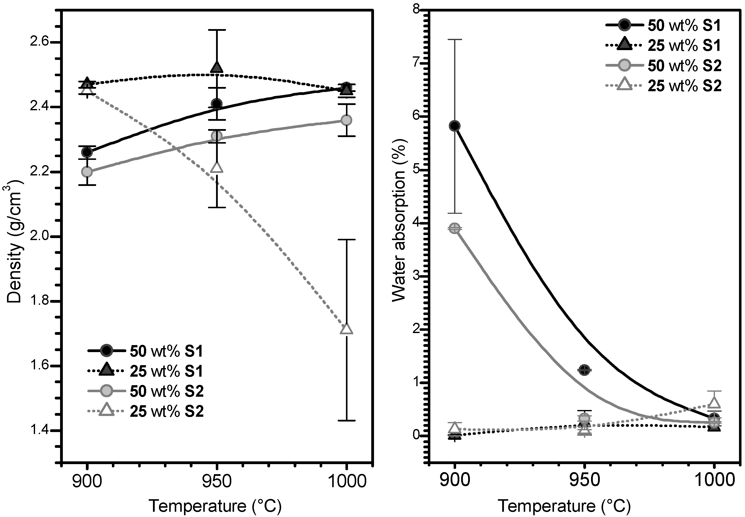 Density and water absorption evolutions with composition and temperature (B-spline lines are provided simply as guides for the readers’ eye).