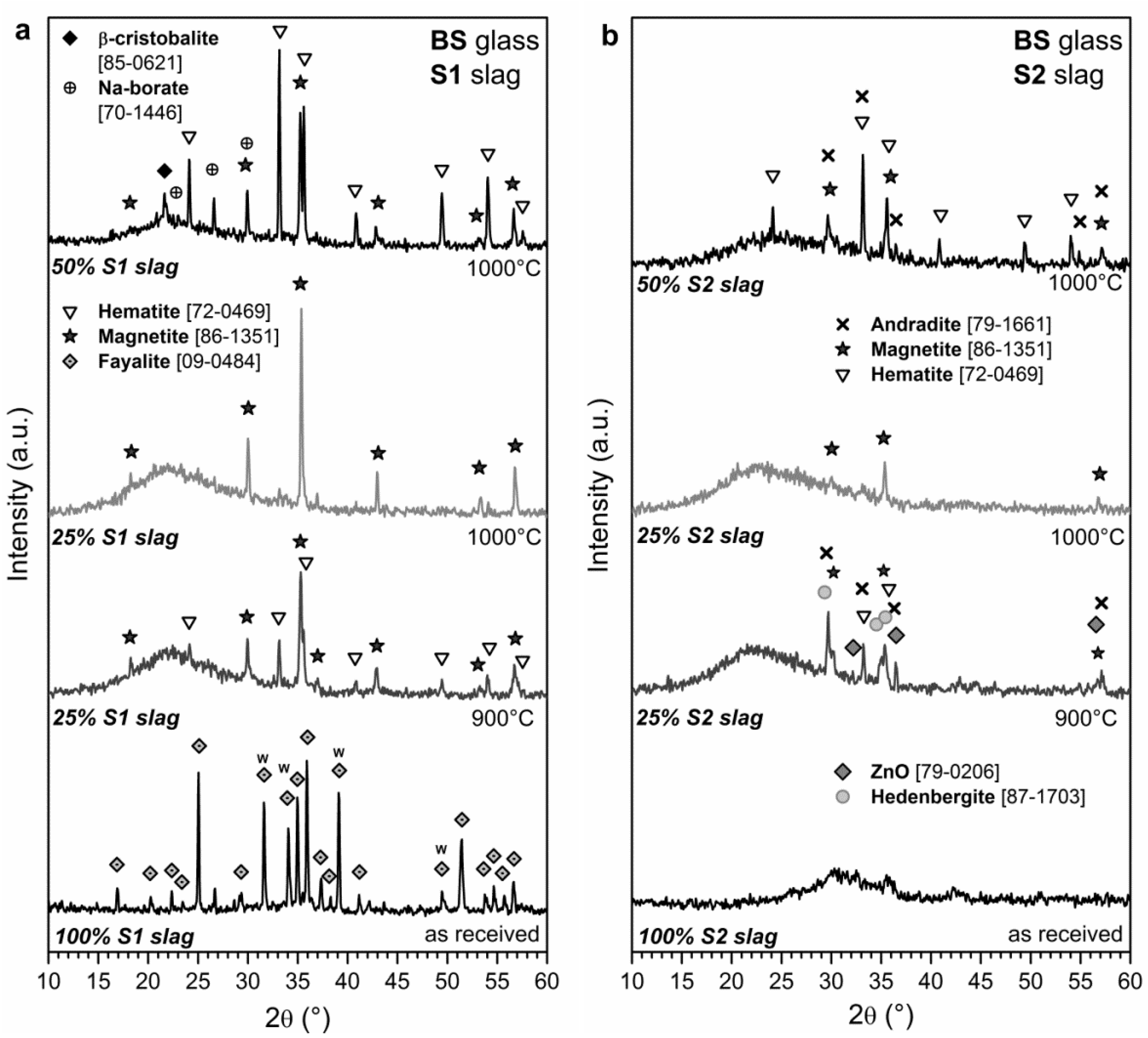 Operating with a high content (50 wt%) of S2 slag, in analogy with the samples made with the S1 slag, the formation of more oxidized phases was favored. In fact, magnetite is present (see the upper pattern of Figure 2b) coupled with andradite and hematite.