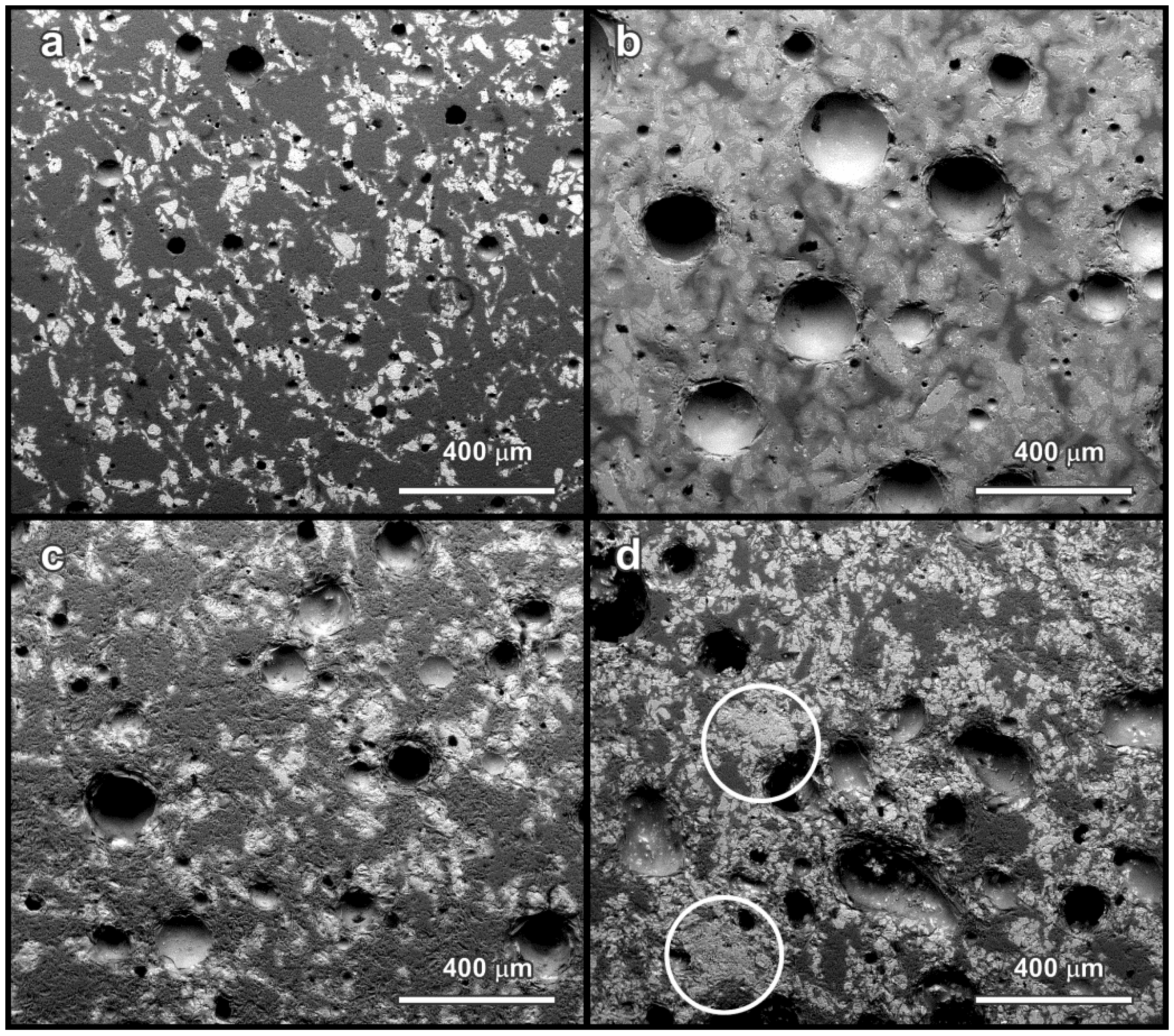 The SEM micrographs in Figure 3 confirm a quite homogeneous distribution of components in the glass ceramic microstructure. In particular, iron-containing phases may be easily distinguished from the light color in the back-scattered electrons images. The homogeneity is particularly important for the stabilization of pollutants. In fact, the chemical homogeneity of a glass ceramic from simple sintering of glass/slag mixture is obviously lower than that of a glass ceramic obtained from melting, solidification of glass and crystallization; pollutants may selectively accumulate in aggregates of slag particles not completely encapsulated in the liquid phase provided by the glass. Except for Figure 3d (see the highlighted areas), showing a sample with 50 wt% S2 slag, sintered at 1000 °C, no large slag-derived aggregates are visible. On the contrary, the sample with 50 wt% S1 slag sintered at 1000 °C, shown in Figure 3b, exhibits iron-rich phases (light spots) surrounded by a light halo. In our opinion, this could be due to iron diffusion in the borosilicate glass, further evidence of glass/slag interactions.