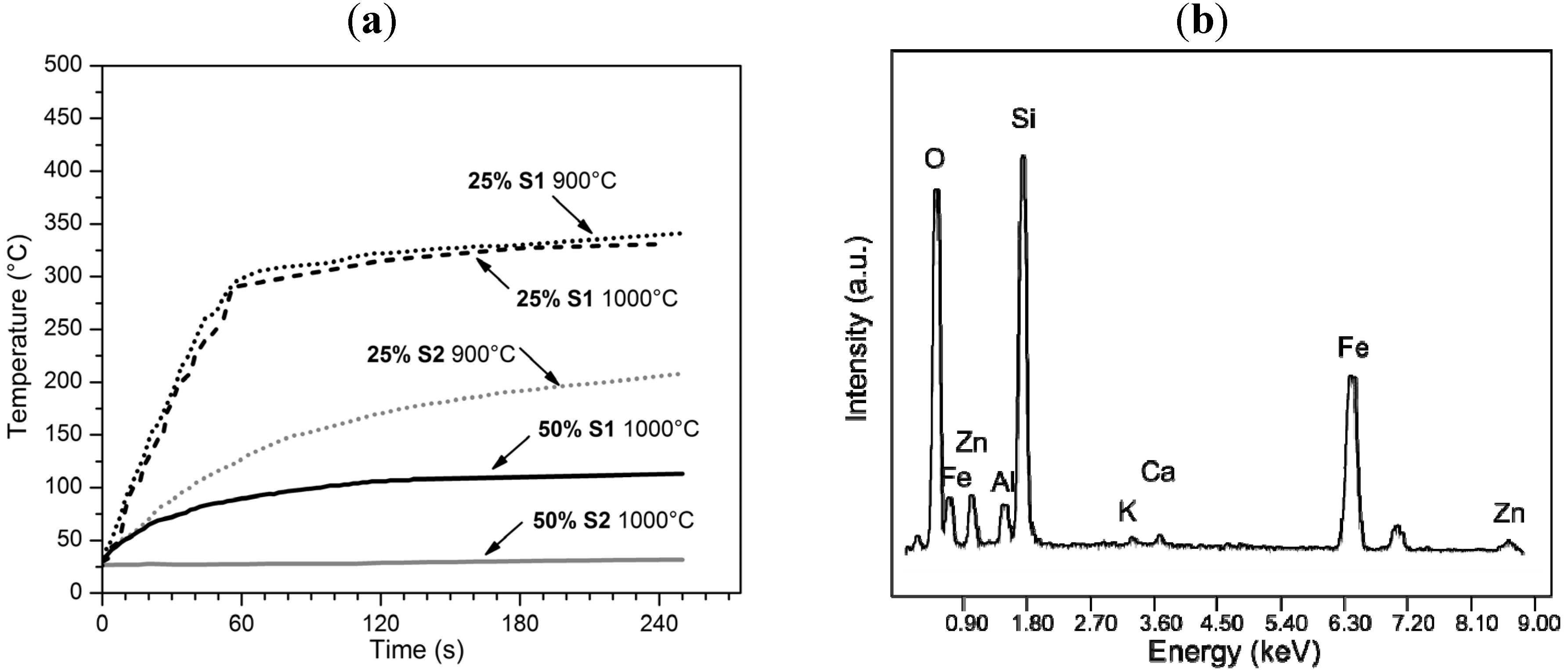 The samples with high slag content presented poor (50 wt% S1) or even no (50 wt% S2) temperature increase, despite the presence of magnetite. This phenomenological “anomaly” could be justified by the observed ionic inter-diffusion, as discussed earlier. Samples treated at 1000 °C did not feature pure magnetite, but a solid solution, comprising ions, such as Zn2+, as demonstrated by the EDS spectrum in Figure 4b. Ferrites, i.e., compounds with the general formula M2+O∙Fe2O3, are known to exhibit lower heating rates compared to magnetite [35]. The formation of a Zn-containing solid solution, instead of pure magnetite, could be the reason also for the behavior of the sample containing 25% S1 slag, sintered at 1000 °C; despite the more intense peaks of ferrimagnetic phase (and no evidence of hematite) in Figure 2b, it was similar, in its electromagnetic heating behavior, to the sample from S1 slag, sintered at 900 °C.