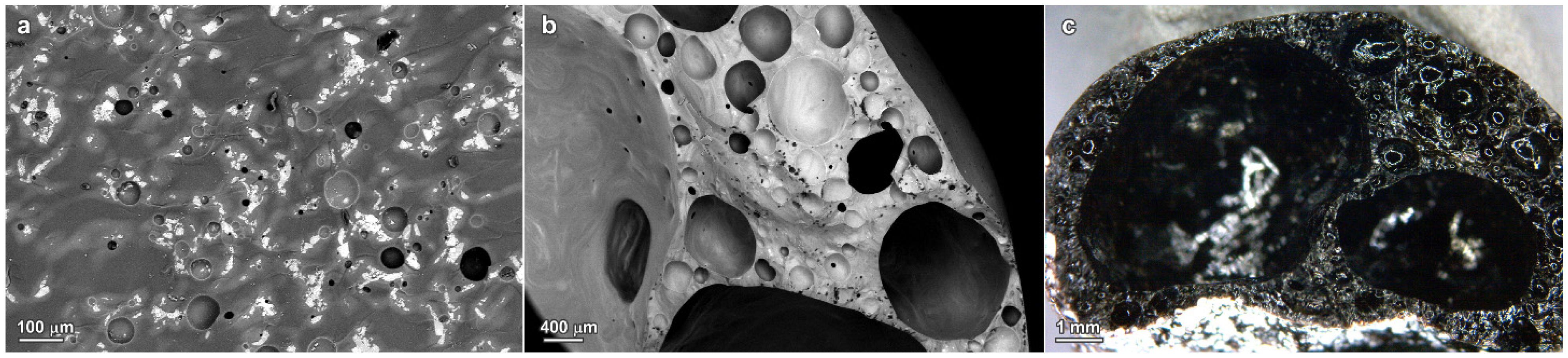 The interdiffusion, at 1000 °C, between glass and slags, even in a low concentration (25 wt%), is testified by Figure 5. The SEM image in Figure 5a, referring to the sample with 25 wt% S1, clearly shows more “isolated” light spots (rich in iron), than in the case of the sample with the same composition sintered at 900 °C (Figure 4a), but also wide diffusion halos around the spots, like in the sample sintered at the same temperature, with higher slag content. The interdiffusion is so extensive for the sample with 25 wt% S2, that halos turn into “streaks”, evident in Figure 5b, around big pores. The big pores, for this sample, as written above, actually correspond to a foaming effect, further evidenced by the optical stereomicroscope image in Figure 5c.
