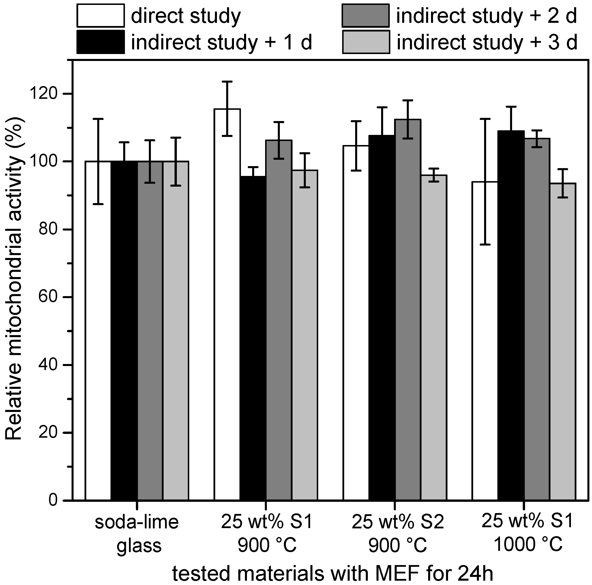 Figure 6 illustrates the relative mitochondrial activity of MEF cells after 24 h of seeding on waste-derived glass ceramics and soda-lime glass, according to both direct and indirect studies. It can be noted that the mitochondrial activity of samples was practically equivalent to that of the reference glass. During the direct study, sample topology directly impacted on cell adherence. The higher values found for samples 25 wt% S1 900 (113% ± 9%) and 25 wt% S2 900 (106% ± 8%) could be attributed to porosity, which could favor the adhesion of fibroblasts. During the indirect study (black and grey bars), cells seeded on microplates were in contact with ions in the medium, released by samples after 1, 2 and 3 days of dilution. The fluctuation of values was not interpreted further, but it might depend on parameters, such as diffusion rate and concentrations of ions in the medium, synergies and interfacial cell/ion biological reactions. Only a significant drop of mitochondrial activity (not observed) could be reasonably attributed to environmental toxicity. In fact, the non-toxicity value limit value could be set at 50% mitochondrial activity, relative to the reference glass, according to previous toxicology studies [39]. We can therefore state that, under the conditions of the applied test, none of the samples presented toxicity risk, even after three days (indirect study), which was accepted as a significant period to indicate cytotoxicity, considering the quasi-instantaneous reactivity of MEFs to their environment [18,39]. Furthermore, no significant change is observed with increasing firing temperature (the similarity of samples with 25 wt% S1, sintered at 900 or 1000 °C, besides in electromagnetic heating, is confirmed in terms of chemical stability).