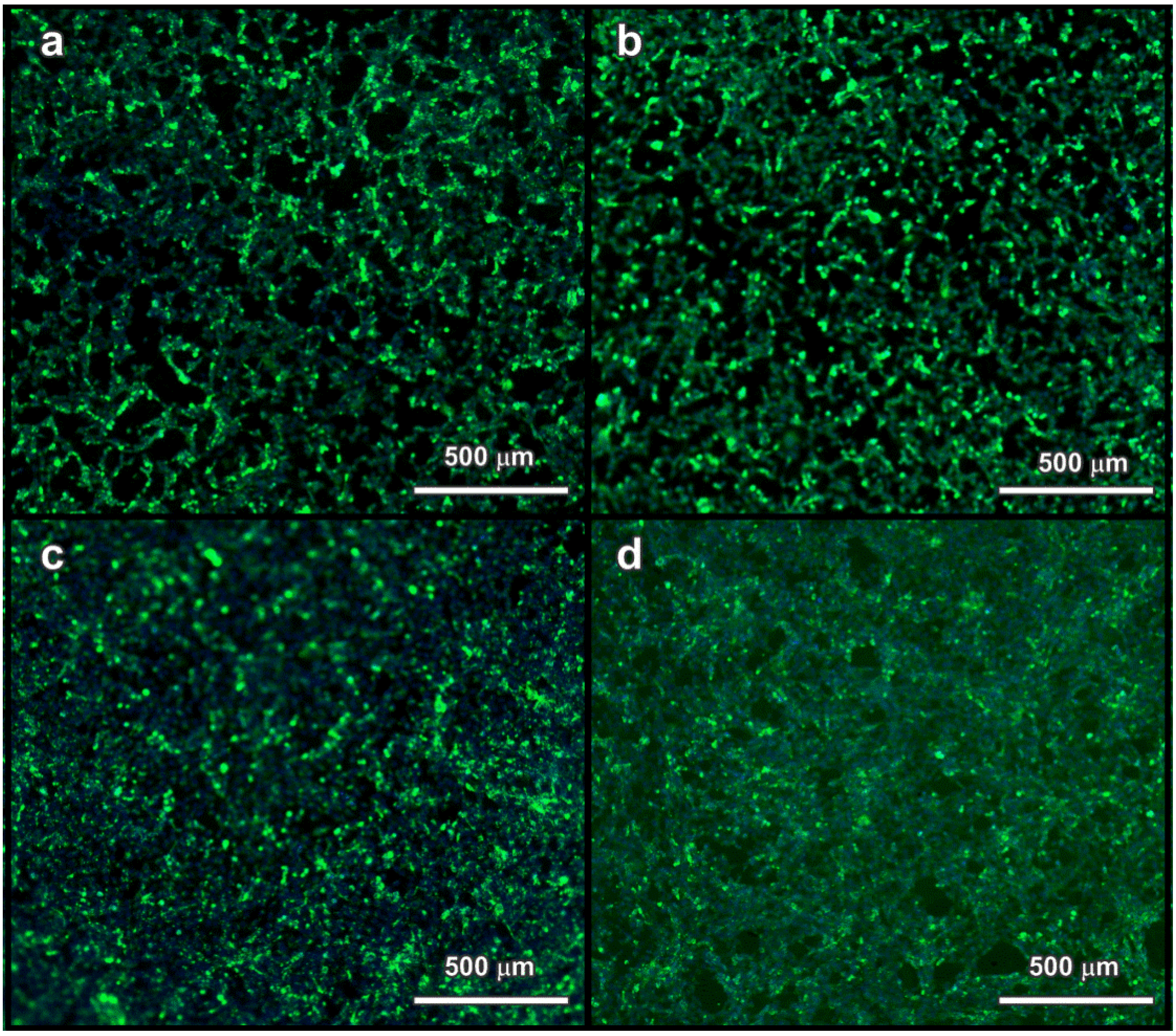 Fluorescence microscope images of samples from direct test method (a) 25 wt% S1 900 °C; (b) 25 wt% S2 900 °C; (c) 25 wt% S1 1000 °C; (d) soda-lime glass (reference) (with superposition nucleus (blue) and cell body (green)).