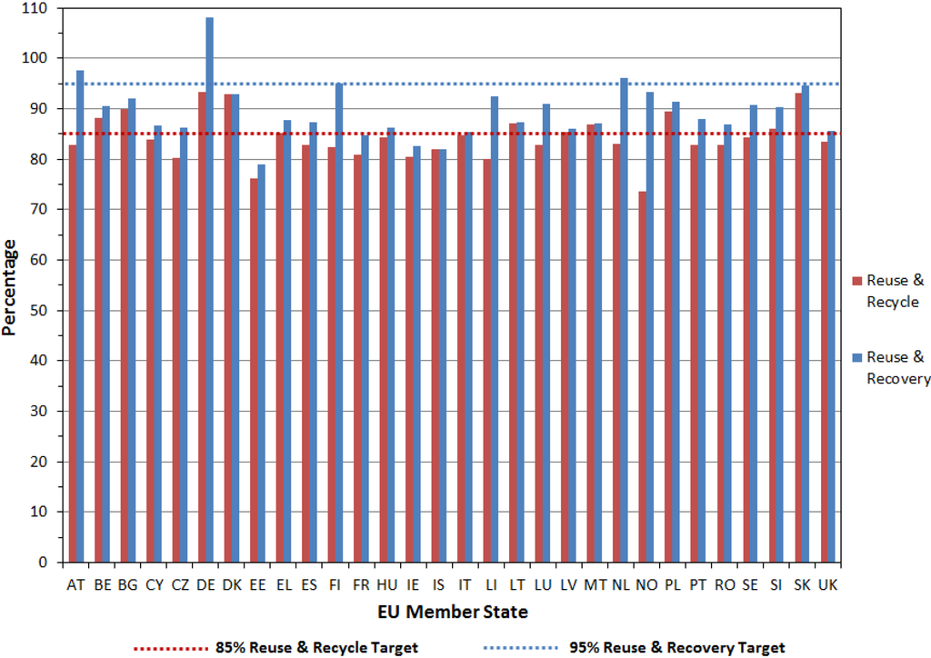 Figure 3. End-of-life vehicle (ELV) recovery and recycling rates reported by EU member states for 2011 [33].