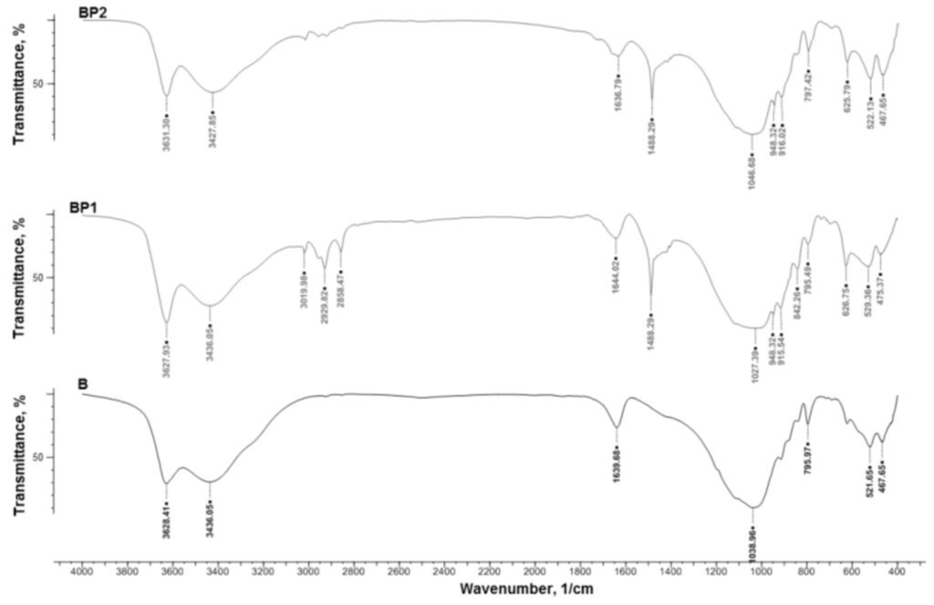The IR spectra of the bentonites were recorded on a Nicolet 8700 spectrophotometer (Thermo Electron Scientific Instruments LLC, Madison, WI, USA), in the range 4000–4550 cm−1, using the KBr pellet technique (1 mg sample/200 mg KBr).