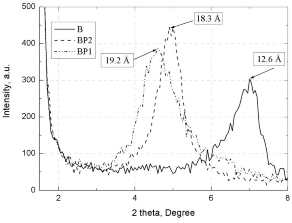 43. Serratoza, J.M.; Johns, W.D.; Shimoyama, A. IR study of alkyl-ammonium vermiculite complex. Clays Clay Miner. 1970, 18, 107–113. [Google Scholar] [CrossRef]