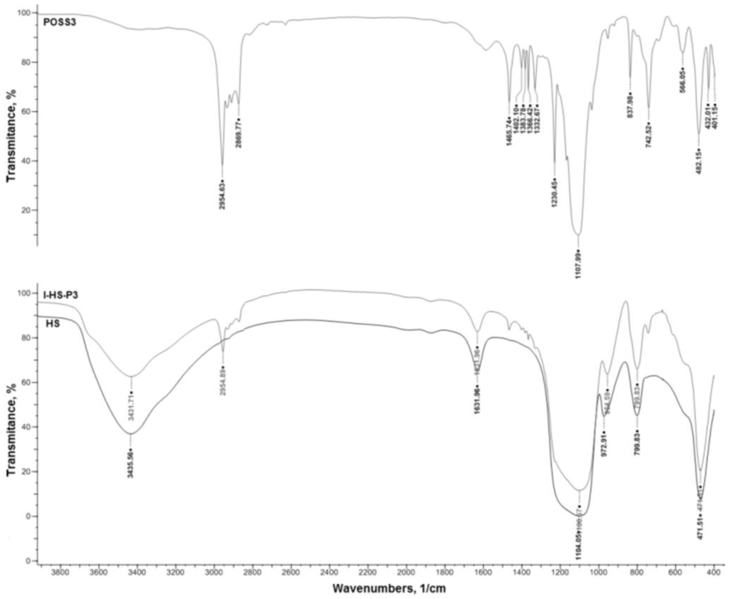The final silica and SiO2/POSS3 hybrid filler were analyzed by a number of methods. The effectiveness and degree of functionalization of SiO2 with the POSS compound were estimated using an FTIR IFS 66 v/S spectrophotometer (Bruker Optik GmbH, Ettlingen, Germany). The samples were prepared by mixing with KBr and then pressing into small tablets. FTIR spectra were obtained in the transmission mode between 4000 and 400 cm−1.
