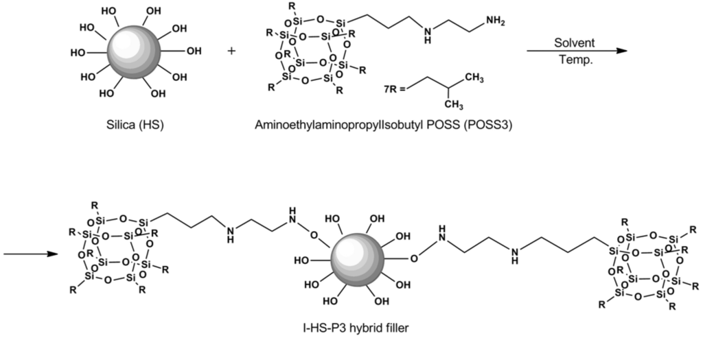 SiO2 filler precipitated in polar media, analogously as in the procedure previously described by Jesionowski et al. [39]. The silica filler surface (HS) was grafted with POSS modifier (POSS3), in a quantity of 20 parts by weight of SiO2.