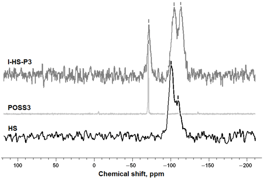 The structure of the silica surface, before and after modification with POSS, was examined using cross-polarization nuclear magnetic resonance tests. 29Si and 13C CP MAS NMR measurements were carried out using a DSX spectrometer (Bruker BioSpin GmbH, Rheinstetten, Germany). For the determination of NMR spectra, a sample of about 100 mg was placed in a ZrO2 rotator with diameter 4 mm, which enabled spinning of the sample. Centrifugation at the magic angle was performed at a spinning frequency of 8 kHz. 29Si CP MAS NMR spectra were recorded at pulse duration 4.5 µs, contact time 1.5 ms, and pulse spacing 6 s. The 13C CP MAS NMR spectra were recorded at 100.63 MHz in a standard 4 mm MAS probe using single pulse excitation with high power proton.