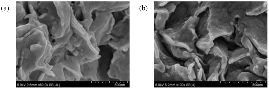 The brittle fracture morphology of the composites was analyzed using scanning electron microscopy (SEM 234a, JEOL Ltd., Tokyo, Japan). Fractured profiles were obtained after cooling in dry ice and impact-break. The microstructure of the composites was also observed using a Tecnai G2 SpiritTwin type 12 transmission electron microscope (TEM) (FEI Company, Hilsboro, NE, USA) at an accelerating voltage of 120 kV. Ultra-thin cuttings were performed at room temperature using a Tesla ultramicrotome (Tescan Orsay Holding, a.s, Brno, Czech Republic) with glass knives. They were collected on the surface of 10% aqueous acetone and placed on standard microscope copper grids.