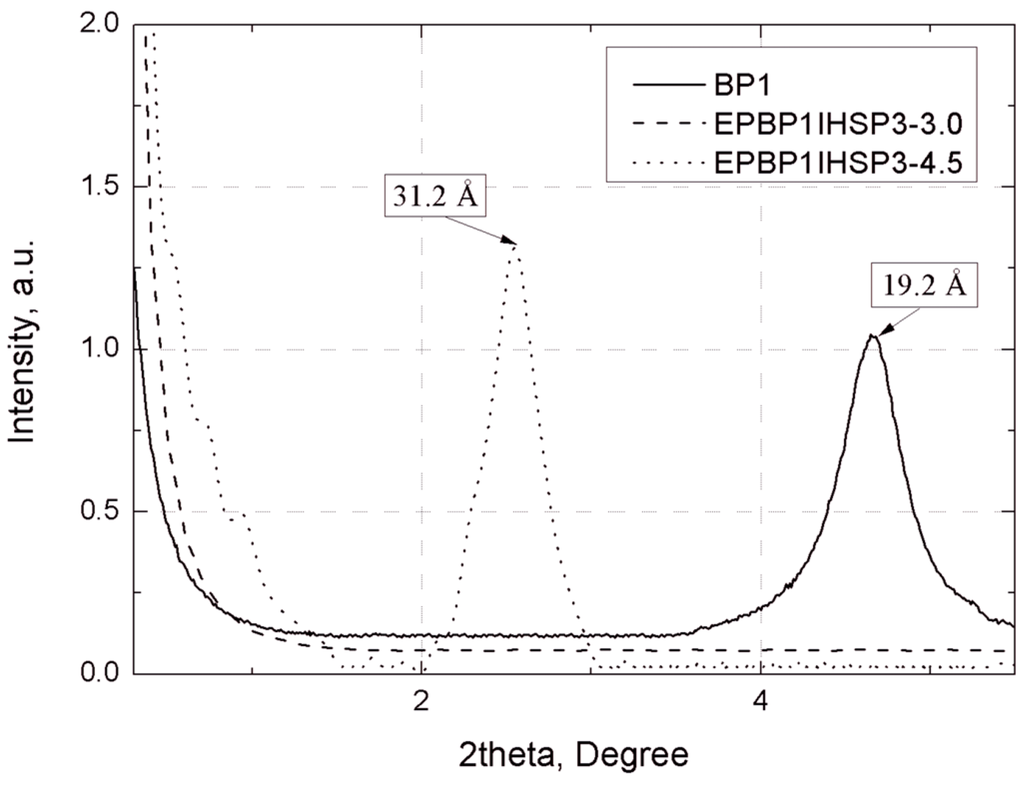 The separation of plates in bentonites and their EP composites was assessed by wide-angle X-ray scattering (WAXS), using Braggs’ law [40]. The measurements were performed using a Bruker Nanostar diffractometer (Bruker AXS, Inc. Madison, WI, USA) with Cu lamp, for the bandwidth Kα. The samples were in the form of disks 25 mm in diameter and 2 mm in thickness, cast from the tested composites. The bentonite samples were tested in powder form.