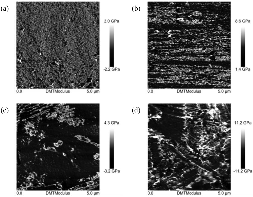 Imaging of the surface of the samples was performed using an atomic force microscope (AFM) (Bruker Nano Surfaces Division, Santa Barbara, CA, USA) by the QNM technique. On the basis of local changes in the Young’s modulus of the sample surface, rigid areas that correspond to the presence of fillers, and areas with less rigidity associated with the polymer matrix, were observed. This enabled estimation of the degree of homogenization of the filler on the surface of the polymer matrix, and of the size of its particles. The tests were performed using a Nanoscope V microscope (Bruker Nano Surfaces Division, Santa Barbara, CA, USA) with an RTESPA scanning needle, with a resonance frequency of 270 kHz. The scanning speed was 1 kHz, and the resolution 256 lines.