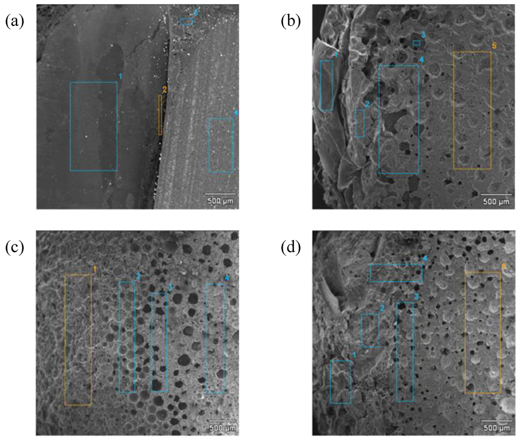 Figure 18. SEM microphotographs and EDS analysis results of samples of burnt EP (a) and composites; (b) EPBP1-3.0; (c) EPIHSP3-3.0; (d) EPBP1IHSP3-3.0. Numbers 1,2,3,4,5, denoted places of EDS analysis of samples sections (see Table 8).