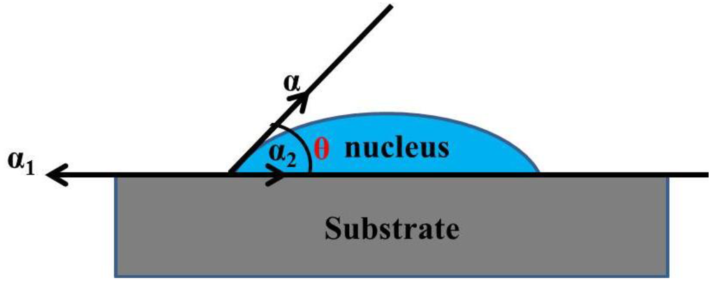 Spherical cap-shaped nucleus on surface: θ refers to the wetting angle (contact angle); α refers to surface tension of spherical cap-shaped nucleus; α1 refers to surface tension of surface; α2 refers to α1 refers to interfacial tension between nucleus and surface. The equilibrium equation of surface tension and interfacial tension is: αcosθ = α1 − α2.