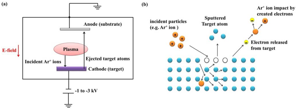 (a) Schematic diagram of a basic sputtering system [11]; (b) schematic sputtering mechanism.