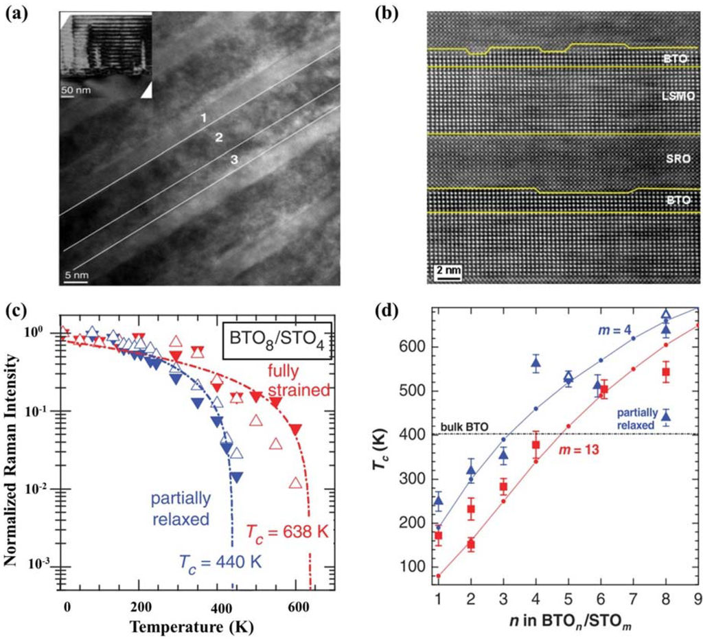Synthesis techniques with atomic-level control also have shed light on artificially designed ferroelectric superlattices, with their physical properties being explored. Direct observation of superlattice structures have been achieved through microscopic techniques (see Figure 5a,b [146]). Enhanced ferroelectric and dielectric properties have been reported in superlattices composed of BTO (ferroelectric: FE) and STO (paraelectric: PE) layers, which is known to originate from the strong strain coupling of ferroelectric polarization in BTO-based ferroelectrics [147]. Dependence of polarization and Tc on layer thickness and superlattice period has been demonstrated as well (see Figure 5c,d) [147]. CaTiO3/BaTiO3/SrTiO3 ((CTO)n/(BTO)n/(STO)n) superlattices have also been designed and raised an intriguing issue of artificially broken inversion symmetry, resulting in enhanced ferroelectric properties [148,149]. Further studies aiming at optimizing properties of superlattices have been carried out. For example, Seo et al. [150] have demonstrated the importance effect of superlattice period on FE polarization, and revealed that both well-strained lattice and proper choice of sub-layer thickness in FE/PE heterostructures are essential for enhancing FE properties in superlattices. Additionally, exchange coupling and exchange bias in (La,Sr)MnO3-SrRuO3 (LSMO-SRO) superlattices with different nanometrically thin interlayers also have been investigated, attracting many interests [146]. To further reveal the excellent properties of ferroelectric superlattices and to optimize superlattice structure designing, systematically experimental investigations are still underway.