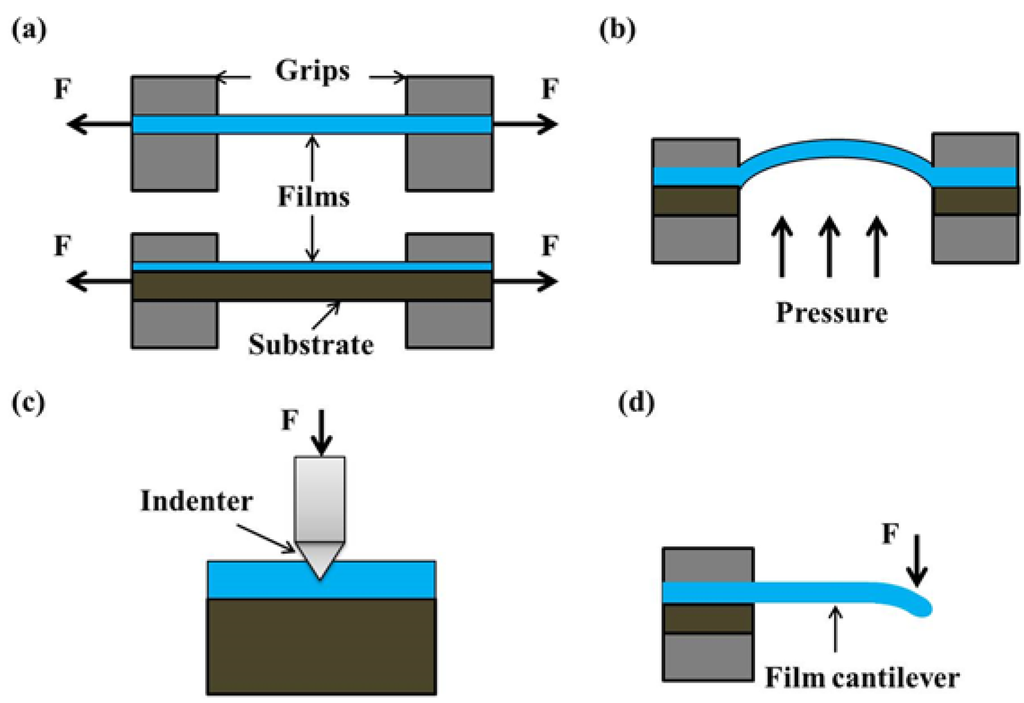 Recent advances in mechanics and material science provide routes to integrated circuits that can offer the electrical properties of conventional rigid wafer-based technologies and with the ability to be deformed arbitrarily (e.g., stretched and twisted) by means of flexible substrates [29]. Flexible substrates, which are usually some plastic or elastomeric substrates, have extended the classes of substrates and attracted much attention for their applications in high-performance flexible electronics [29,30,31]. There are also significant efforts being devoted to transfer (stamp and print by using polydimethylsiloxane (PDMS) stamps or soluble glues) perovskite thin films or nanoribbons onto flexible substrates for the purpose of utilizing the high inherent piezo-properties of ferroelectric materials, or achieving stretchable properties without any loss in ferroelectric/piezoelectric properties [32,33,34]. For instance, PZT, BTO, and STO thin films, originally deposited on rigid substrates, have been successfully transferred onto flexible substrates by removing the sacrificial layers such as SiO2, MgO and TiO2, with the deformation mechanics and material properties being studied [32,33,34,35].