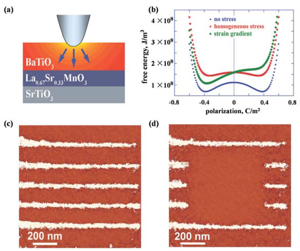 In spite of the widely used PDMS substrates, many flexible substrates have been employed into multifunctional flexible circuits based on ferroelectric thin films both organic (like P(VdF-TrFE) [36]) and inorganic. Some typical examples include polyethylene naphthalate (PEN) [35], polyethylene terephthalate (PET) [37], polyimide (PI) substrates [38], flexible aluminum substrates [36], and thin glass substrates [39] etc. However, the limited processing temperature ranges (mostly less than 300 °C) have restrained applications of those plastic substrates in extreme situations such as crystallization process of inorganic ferroelectrics at high annealing temperature, which may result in sophisticated transferring process. More recently, to solve this problem and simplify experiment process, polycrystalline metal sheet (e.g., polycrystalline Hastelloy tapes) has been proposed to be a promising candidate as the flexible substrate for growth of high performance multifunctional films to meet specific requirements [40]. In general, a buffer layer is usually needed to effectively connect flexible substrates with ferroelectric thin films [40]. It is also noteworthy that significant efforts have been devoted to low-temperature fabrication of promising inorganic ferroelectric thin films (e.g., PZT) on commonly used plastic substrates, among which activated-solution method is an effective one [41]. On the basis of these flexible substrates, ultrathin ferroelectric films can be further studied, with some piezo-related properties such as the specially-focused flexoelectric properties (as will be discussed in Section 4.2) being intensively researched. Moreover, the application scope of ultrathin ferroelectric films can be largely broadened by the use of flexible substrates, with ferroelectric thin-film-based devices such as nanogenerators, sensors and memories systems presenting stretchable properties and working efficiently with proper flexible substrates [32,33].