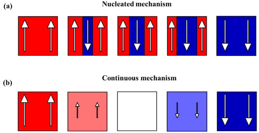 In a MOCVD process, the precursors are metal organic materials, which are transferred to a reaction chamber and sequentially experience physicsorb, chemisorb and nucleation with the following film growth process on the surface. The process of MOCVD is sophisticated on account of many chemical reactions. The technique has superiority to other deposition methods with regard to easy and reproducible control of film stoichiometry, conformal coating of arbitrary geometries, excellent film uniformity, high deposition rates, possible formation of multilayers and graded composition layers, high flexibility in doping and substitution of components, and direct growth of epitaxial or polycrystalline textured films without any subsequent annealing [119,120,121,122,123,124,125]. For the ferroelectrics containing volatile constituents (for instance Pb and Bi), the re-evaporation can be well prevented by the perseverance of relative high gas pressure in the MOCVD chamber. Nowadays, despite routine applications in the electronic industry, the MOCVD technique has advanced into an attractive method for ultrathin ferroelectric deposition, which shows great potential in ferroelectric thin-film fabrication in industrial manufacture. Many high quality thin films of oxide materials have been created using the MOCVD technique like PbTiO3 (PTO), PZT, STO, SBT, Bi(4−x)LaxTi3O12 (BLT) etc. [109,126,127,128,129,130].