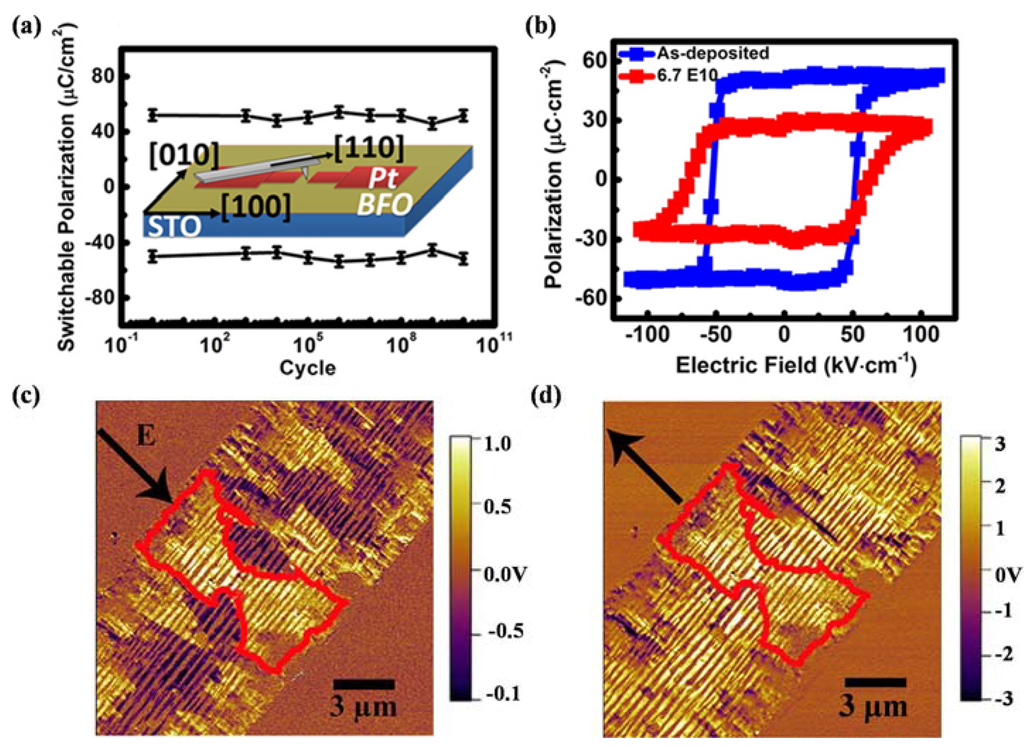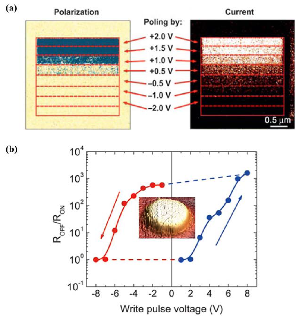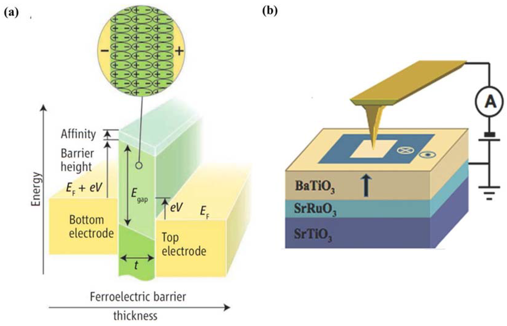 - Guo, R.; You, L.; Zhou, Y.; Lim, Z.S.; Zou, X.; Chen, L.; Ramesh, R.; Wang, J. Non-volatile memory based on the ferroelectric photovoltaic effect. Nat. Commun. 2013, 4. [Google Scholar] [CrossRef]