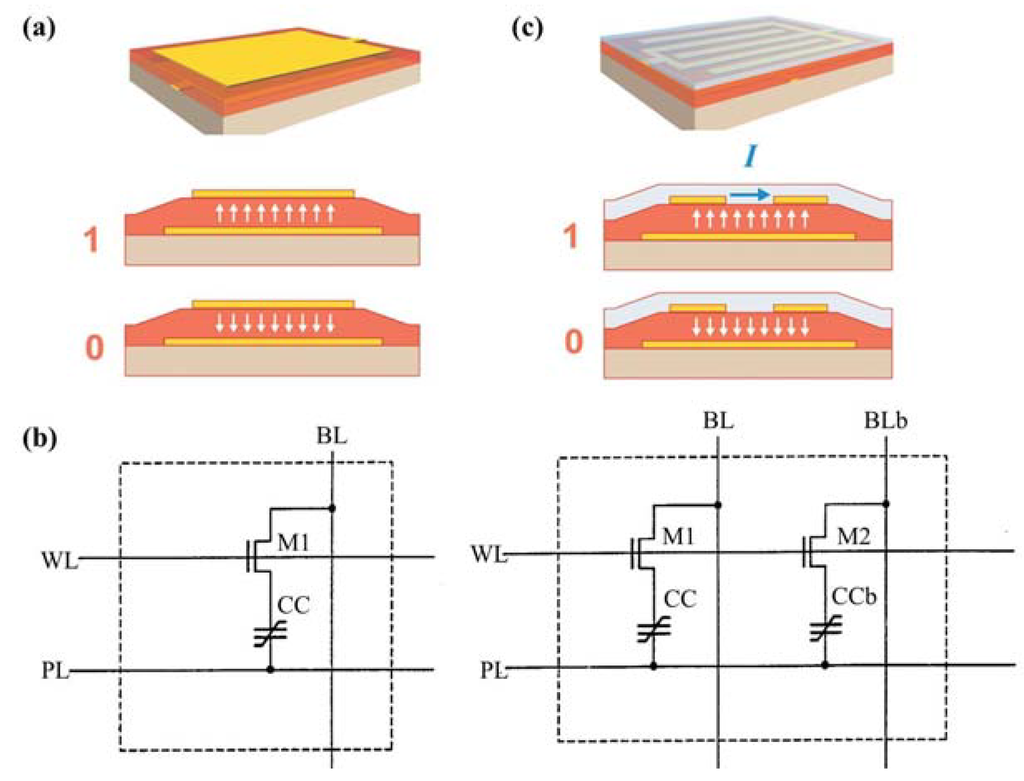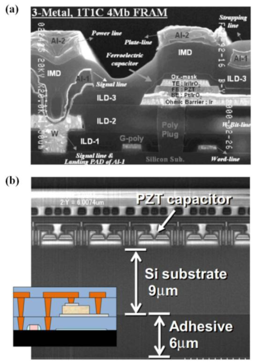 - Rodriguez, J.; Remack, K.; Gertas, J.; Wang, L.; Zhou, C.; Boku, K.; Rodriguez-Latorre, J.; Udayakumar, K.R.; Summerfelt, S.; Moise, T. Reliability of Ferroelectric Random Access Memory Embedded within 130 nm CMOS. In Proceedings of the 2010 IEEE International Reliability Physics Symposium (IRPS), Garden Grove, CA, USA, 2–6 June 2010; pp. 750–758.