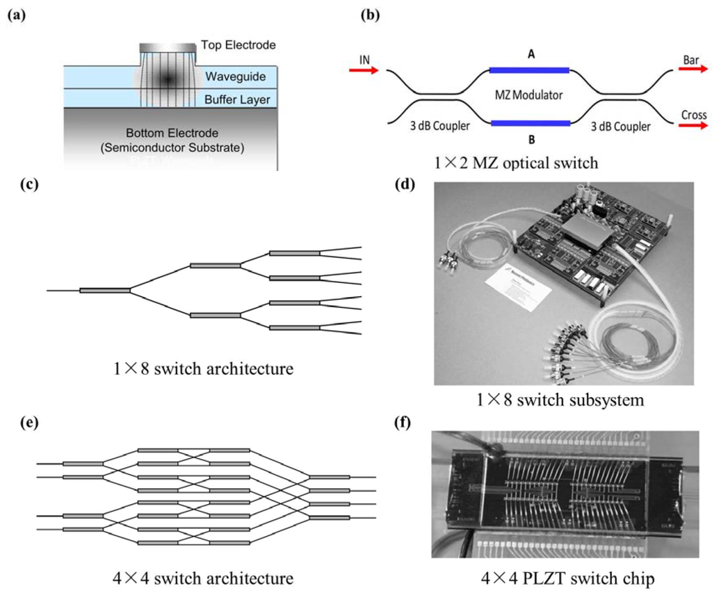 - Nashimoto, K.; Tanaka, N.; LaBuda, M.; Ritums, D.; Dawley, J.; Raj, M.; Kudzuma, D.; Vo, T. High-Speed PLZT Optical Switches for Burst and Packet Switching. In Proceedings of the IEEE 2nd International Conference on Broadband Networks, 2005, BroadNets 2005, Boston, MA, USA, 7 October 2005; pp. 1118–1123.