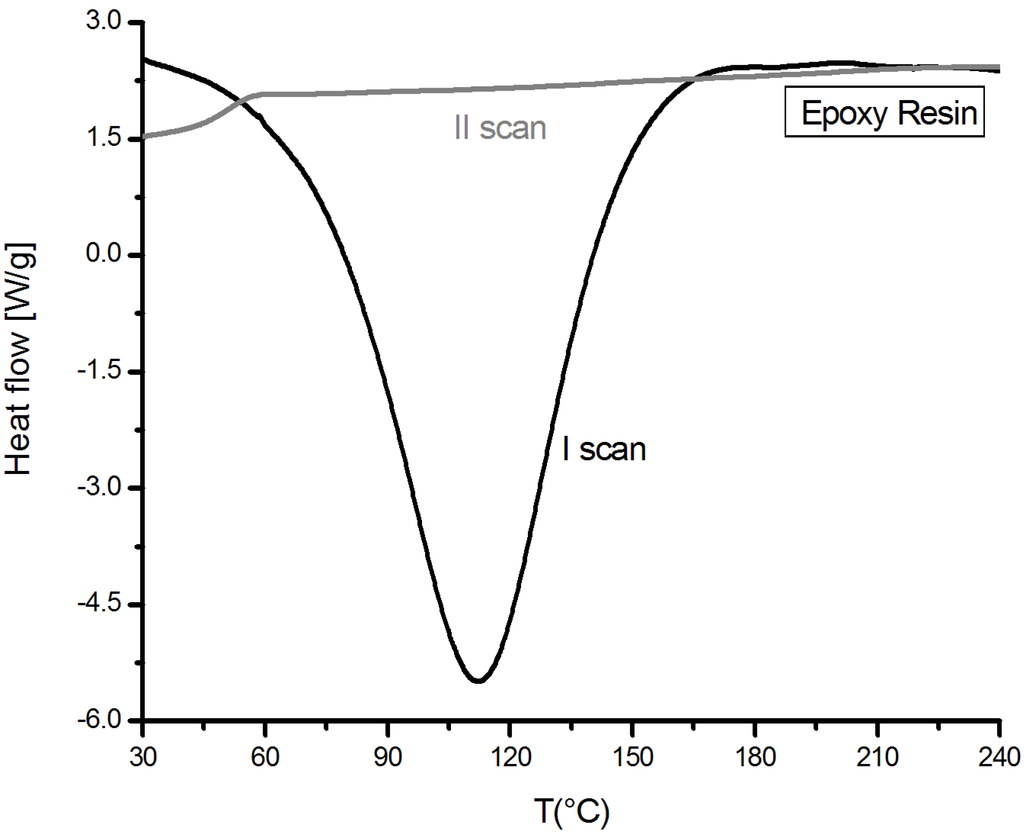 From first DSC curve, it is evident that the cross-linking reaction is able to start at room temperature (around 30 °C) and it can be considered completed at about 200 °C. The reaction is highly exothermic, since it develops a heat of reaction of about 407 J/g. On the other hand, by analyzing in DSC the same samples in a second scan, no residual peak of reaction was found, evidencing that the reaction was completed after the first DSC scan. The fully cured epoxy system was able to achieve a maximum Tg of about 49 °C.
