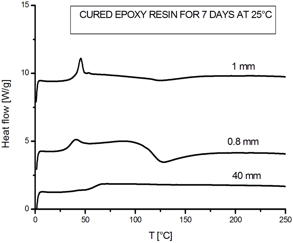Further experimental analyses, performed by DSC dynamic tests, were finally devoted to understanding if the sample thickness could influence the curing reaction of the resin. To this aim, several cold-cured epoxy specimens, with thickness ranging from 0.8 to 40 mm, were produced, kept in laboratory at room temperature and characterized by dynamic DSC scans. In view of the fact that curing times longer than one week seem to have only a slight influence on the proceeding of the cross-linking reactions (see Figure 2), a curing time of 7 days was selected and used for the experimental measurement. The thermograms obtained for the samples possessing thickness of 0.8, 1 and 40 mm are reported in Figure 3.