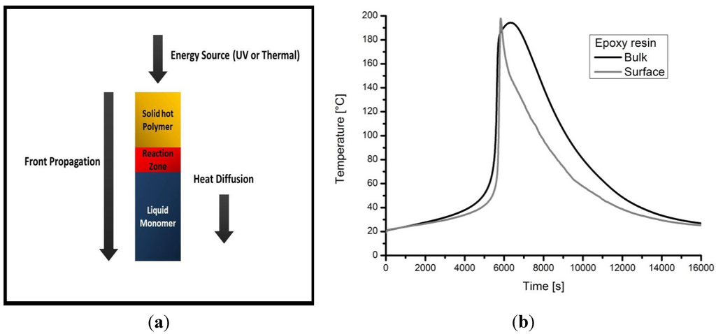 A schematic representation of the possible frontal polymerization reaction and the temporal temperature profiles obtained from the two thermocouples placed in the bulk and on the surface of the epoxy 40 mm thickness sample are reported in Figure 4a,b respectively.