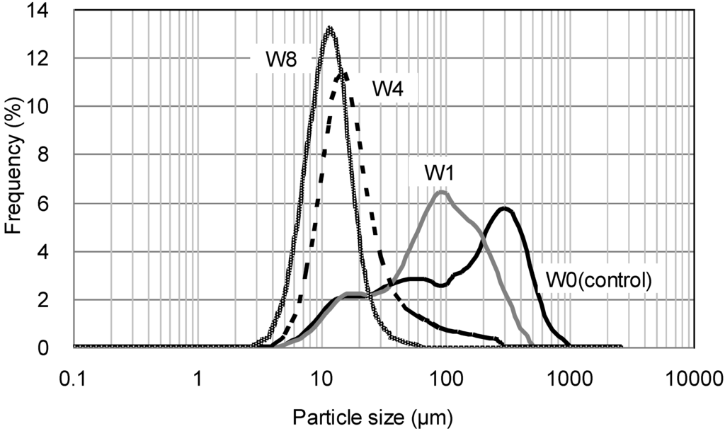 Table 2 shows the median particle size of LCNF after disk milling. Smaller particle sizes were obtained with increased pass number. The particle size of the W8 LCNF was less than one tenth that of W0 (control). Figure 1 shows the particle size distributions of W0 (control), W1, W4, and W8. The variation in the particle size of the control was relatively large. Smaller variations in particle size were obtained with increased pass number. Therefore, it is possible to control the size uniformity of wood flour particles by adjusting the settings of the disk mill and/or the pass number.