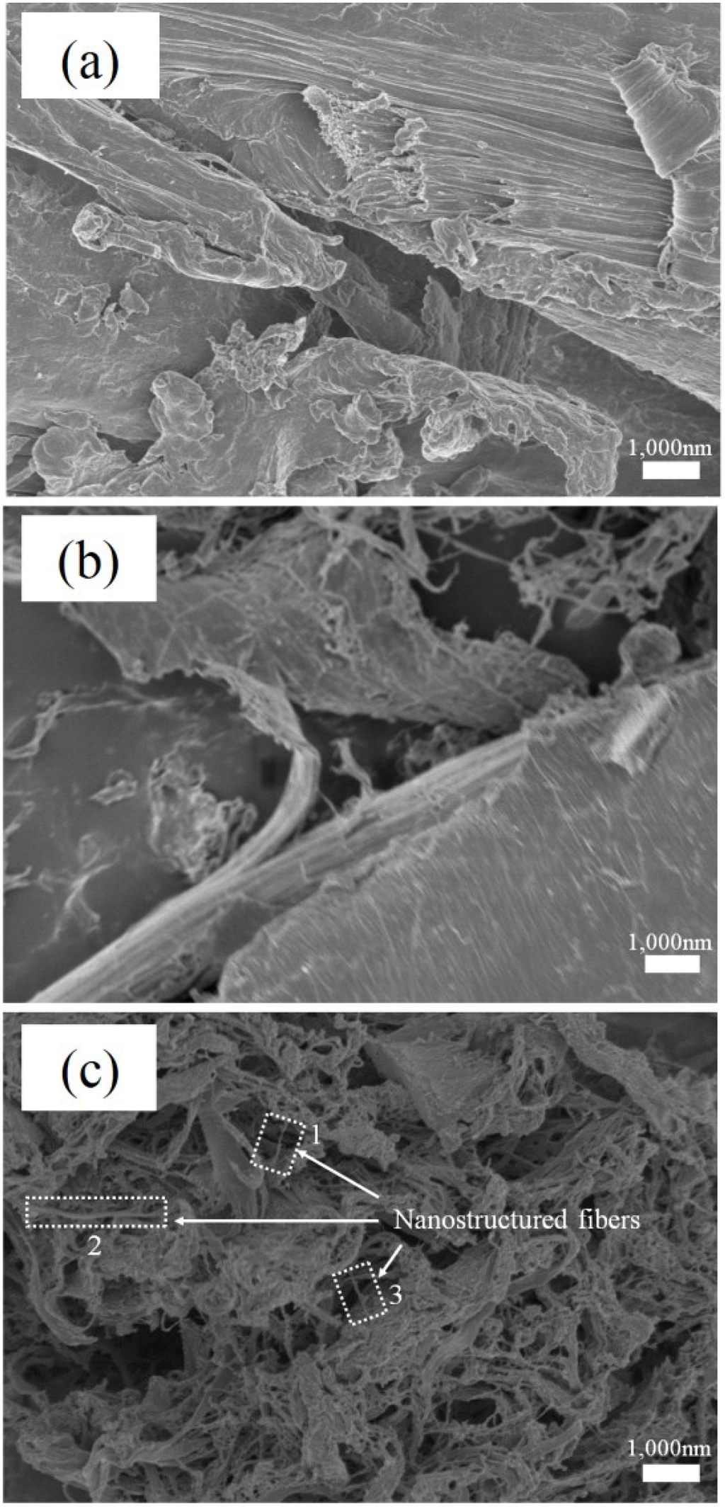 SEM micrographs show the surface morphology of (a) untreated WF; (b) LCNF (W4); and (c) LCNF (W8). Representative nanostructured fibers were enclosed by dotted frame. The diameter of each nanostructured fibers are approximately (1) 66.4 nm, (2) 97.9 nm, and (3) 87.4 nm, respectively.