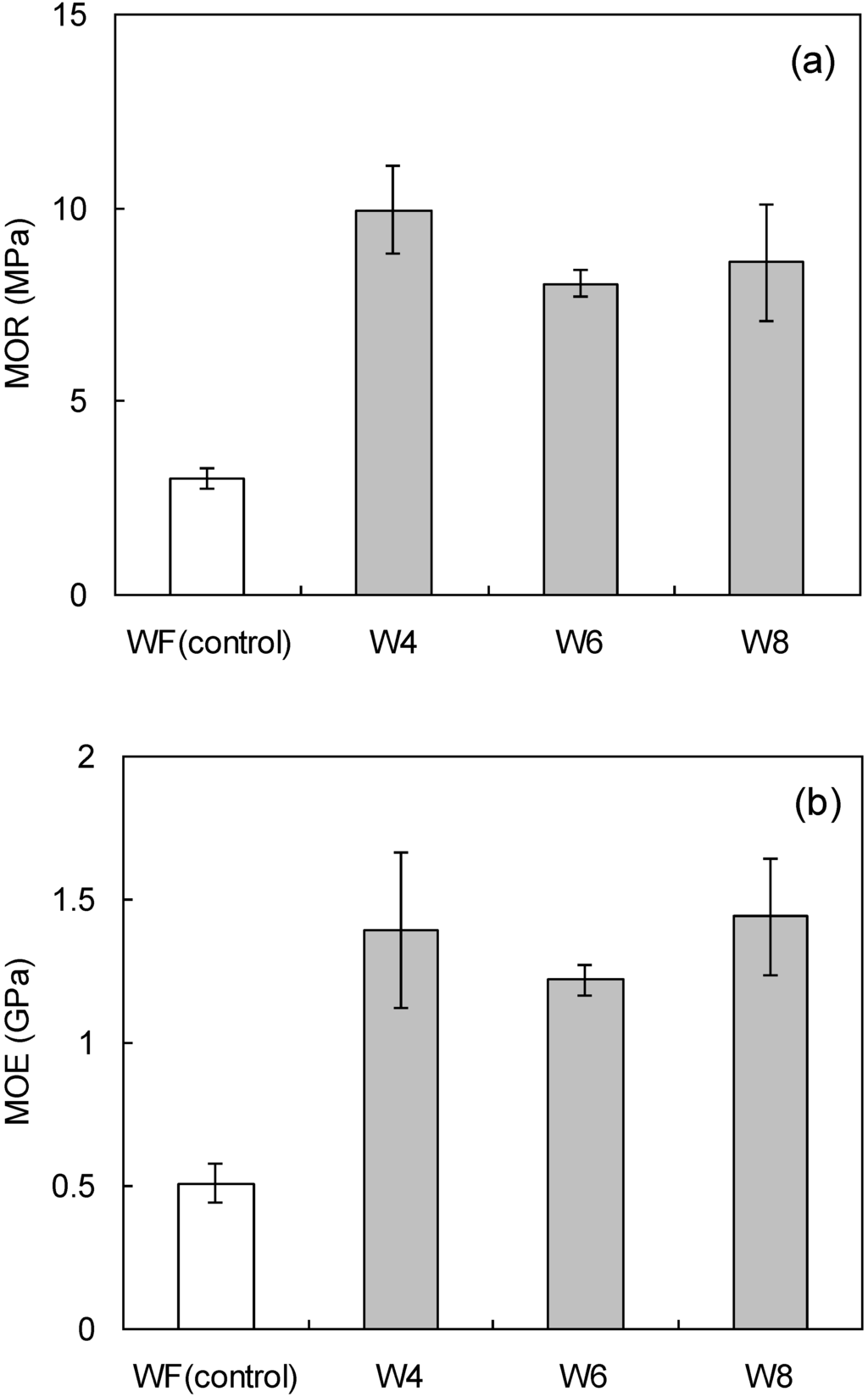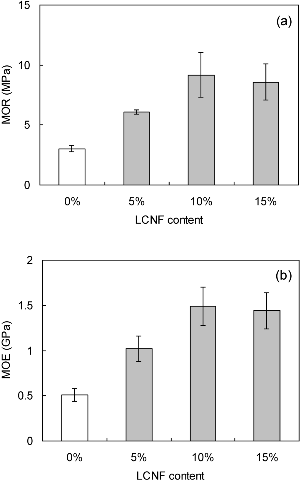 The bending properties, (a) modulus of rupture (MOR) and (b) and modulus of elasticity (MOE) are given for W8 composites as a function of LCNF content. The vertical bars indicate a single standard deviation.