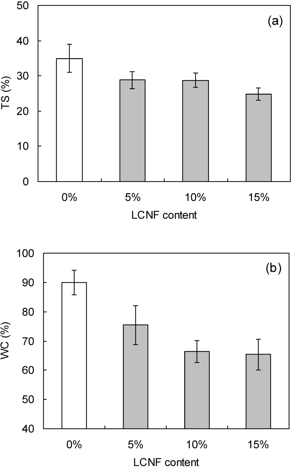 (a) TS and (b) WC of wood flour/LCNF composites are given following water absorption as a function of LCNF content. The vertical bars indicate a single standard deviation.